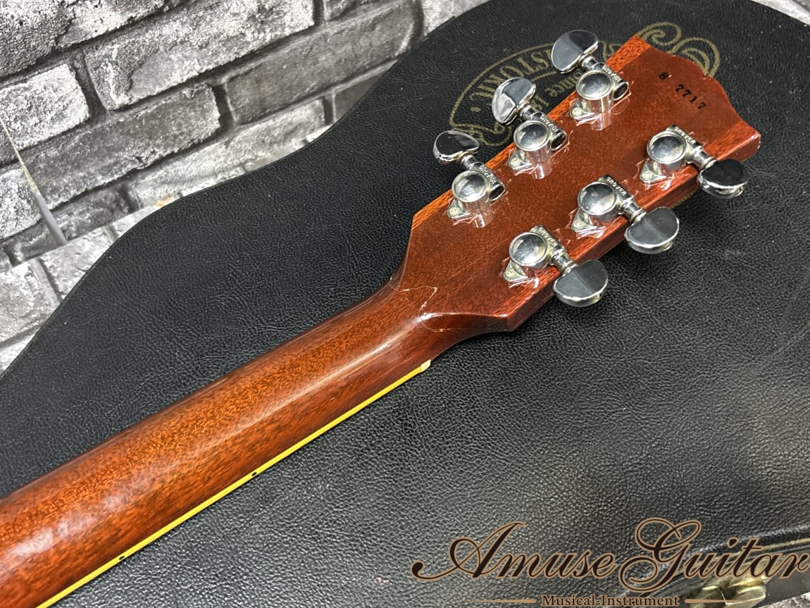 状態につきましては、上記パーツ交換(ペグ、ナット、ピックアップ、ストラップピン)の他、ネック補修歴がございます。しっかりとしたリペアが施されており使用には問題ございません。その他、ペグ交換歴(穴埋め加工済み)、スレ、打痕、バインディングクラック、パーツ経年、ノブの割れ、サイドジャックプレートの割れ、ウェザーチェック等、年式相応の状態変化はございますが、演奏面に支障のある部分はございません。ネック状態につきましても、トラスロッドの余裕もシッカリと確認済み。オリジナルフレット残りも7~8割以上残りでまだまだ使えます。付属品につきましてはファクトリー発行チェックシート、レンチ、シャーラーストラップアタッチメント、オリジナルのロゴ入りハードケースとなります。