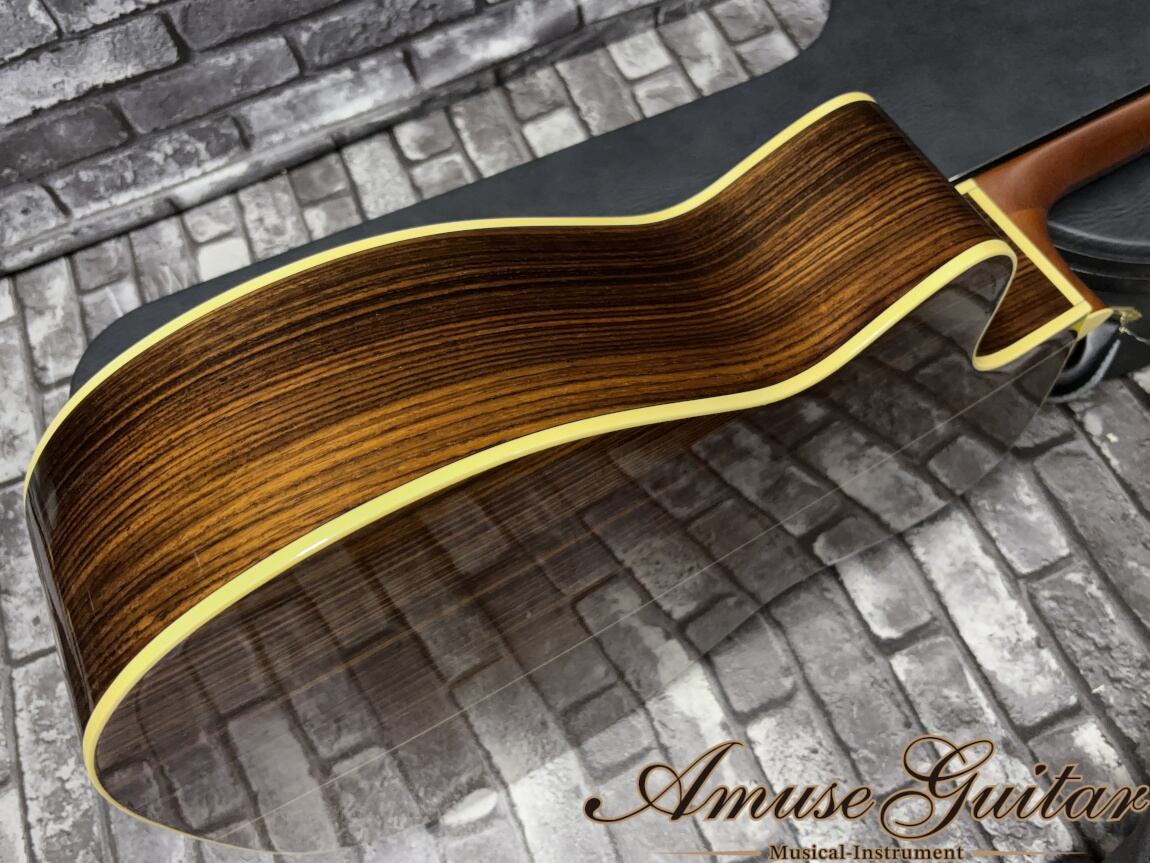 こちらの個体は、ボディトップにシダー単板、サイド&バックにはローズウッド、ネックはマホガニー、指板とブリッジにはエボニーを採用した王道スペック。トップのシダー材は、立ち上がりの速さと柔らかなコンプレッション感が特徴で、軽いタッチでもしっかりと音が前に出てくれる扱いやすさが魅力です。一方でローズウッドらしい中低域の厚みと奥行きが加わることで、フラットに鳴らしても薄くならない“芯のあるサウンド”を実現しています。スケールは645mm、ナット幅は約42mm。Shellyオリジナルのカッタウェイボディに、ボディ厚はしっかりと確保された約115mmクラスの設計となっており、カッタウェイながらフルサイズらしいボリューム感のある鳴りを体感いただけます。ピックガードは茶べっ甲調のShellyオリジナル形状、セルバインディングによる落ち着いた装飾も相まって、シックで上質な佇まいに仕上がっています。