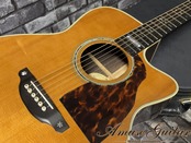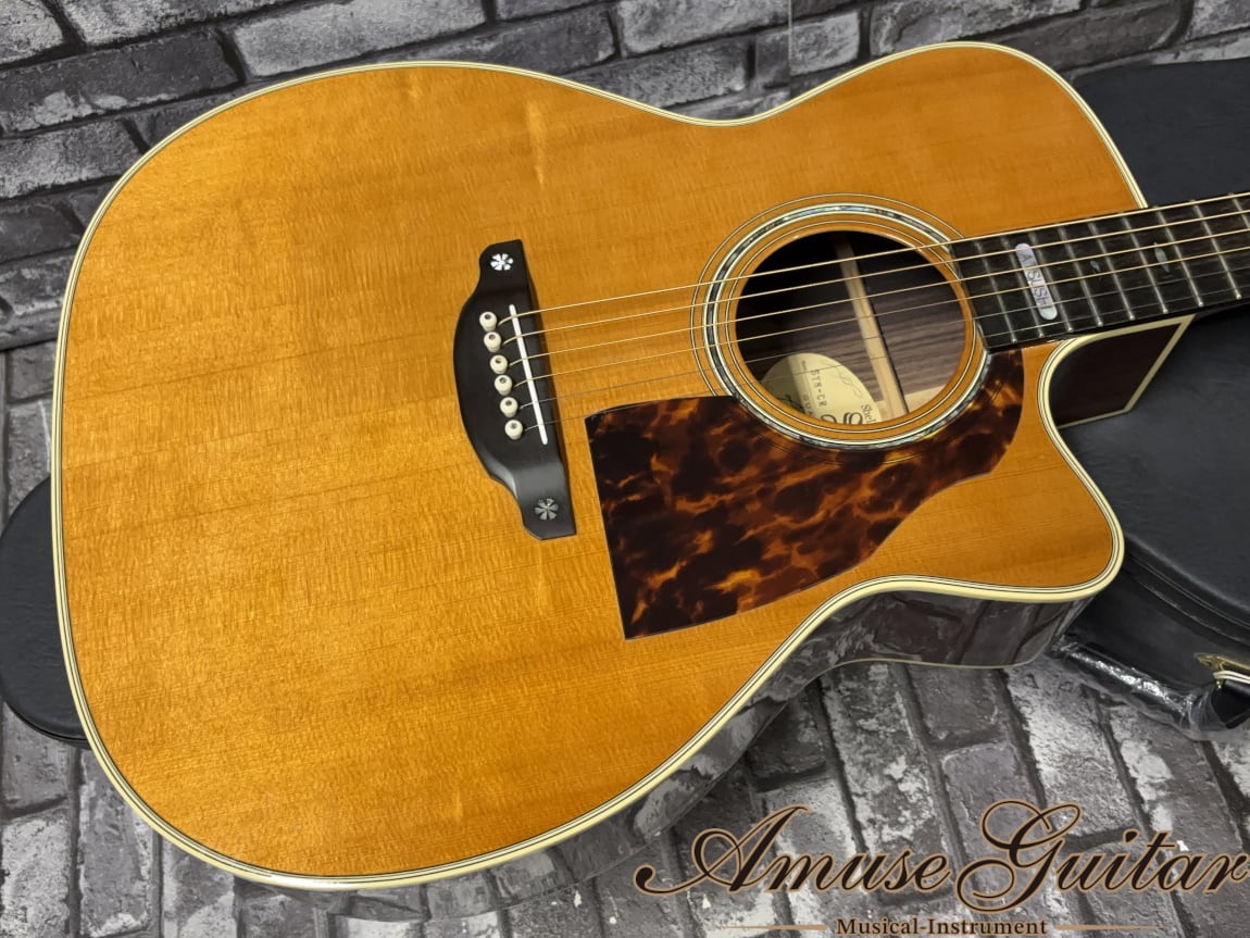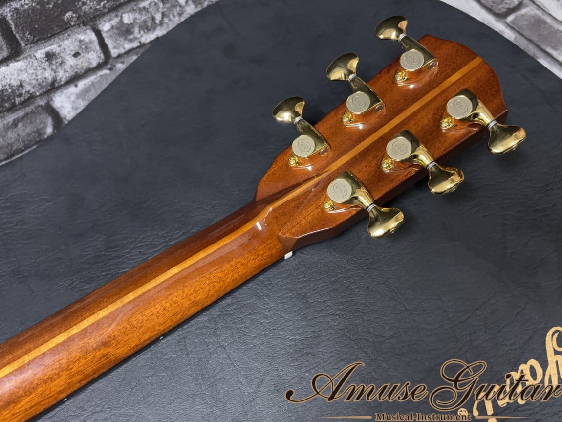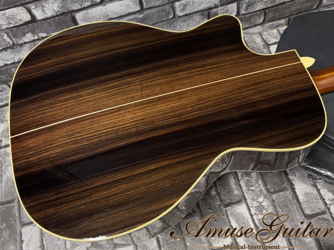 こちらのスペックは、ボディトップに単板スプルース、サイド&バックに単板インディアンローズウッドを採用。ネックにはセンターメイプルを挟んだ3P構造のマホガニーネック、指板とブリッジはエボニーと、いずれもグレードの高い材が惜しみなく使用されています。ルックスと鳴りのバランスに優れた材選定で、見た目の上質さと、実際の音抜け・芯の太さがしっかりと両立されています。スケールは約645mm、ナット幅は約43mm、20フレット仕様のセットネック構造となります。その他の特徴としましては、オリジナカッタウェイのボディシェイプ。ヘッドロゴはメキシコアワビ貝。指板とブリッジにStyle 45 Snow Flakesインレイ。ペグはGotohのSGV 510-L5-GG等が挙げられます。