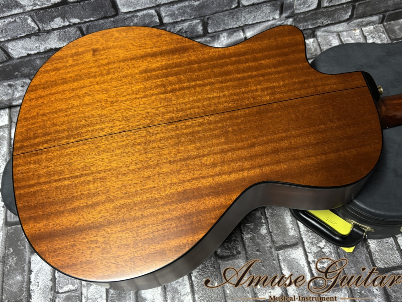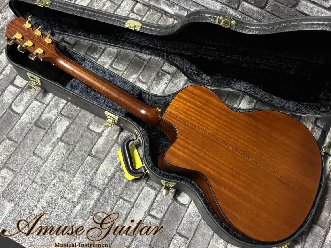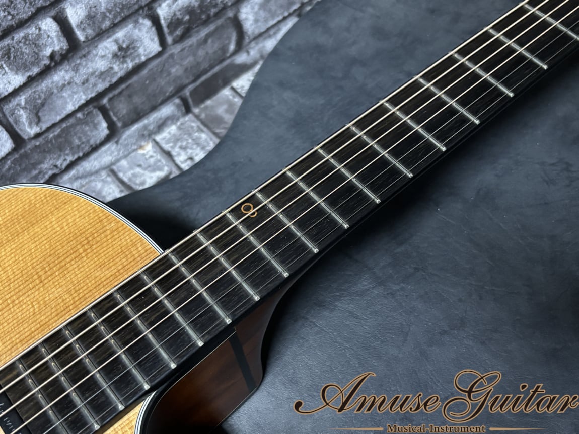 此方のスペックは、ボディトップにシトカスプルース単板を採用し、立ち上がりの速さと芯のある鳴りを両立。サイドには剛性の高いボリビアン・ローズウッドのラミネート材、バックにはソリッド・マホガニーを組み合わせた本機最大の個性で、トップの響きを素直に活かしつつ、音像を適度に引き締めたバランスの良いサウンドキャラクターに仕上げられています。ネックはマホガニー、指板/ブリッジはエボニー材の王道マテリアル。スケールは645mm、ナット幅は42mm、20フレット仕様に加え、このモデルのために新設計されたオリジナルボディシェイプ(全長約1020mm / ボディ巾約390mm)を採用。ブレイシングにはフォワードシフテッド設計+HQスキャロップ(スキャロップドX)を組み合わせ、低域から高域までのレンジ感とレスポンスを底上げしています。トップはグロス、サイド/バックは艶消しの質感でまとめられ、80周年モデルらしい専用意匠(オリジナルブリッジ/インレイ等)も“限定機”のムードをしっかり主張します。