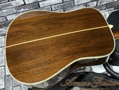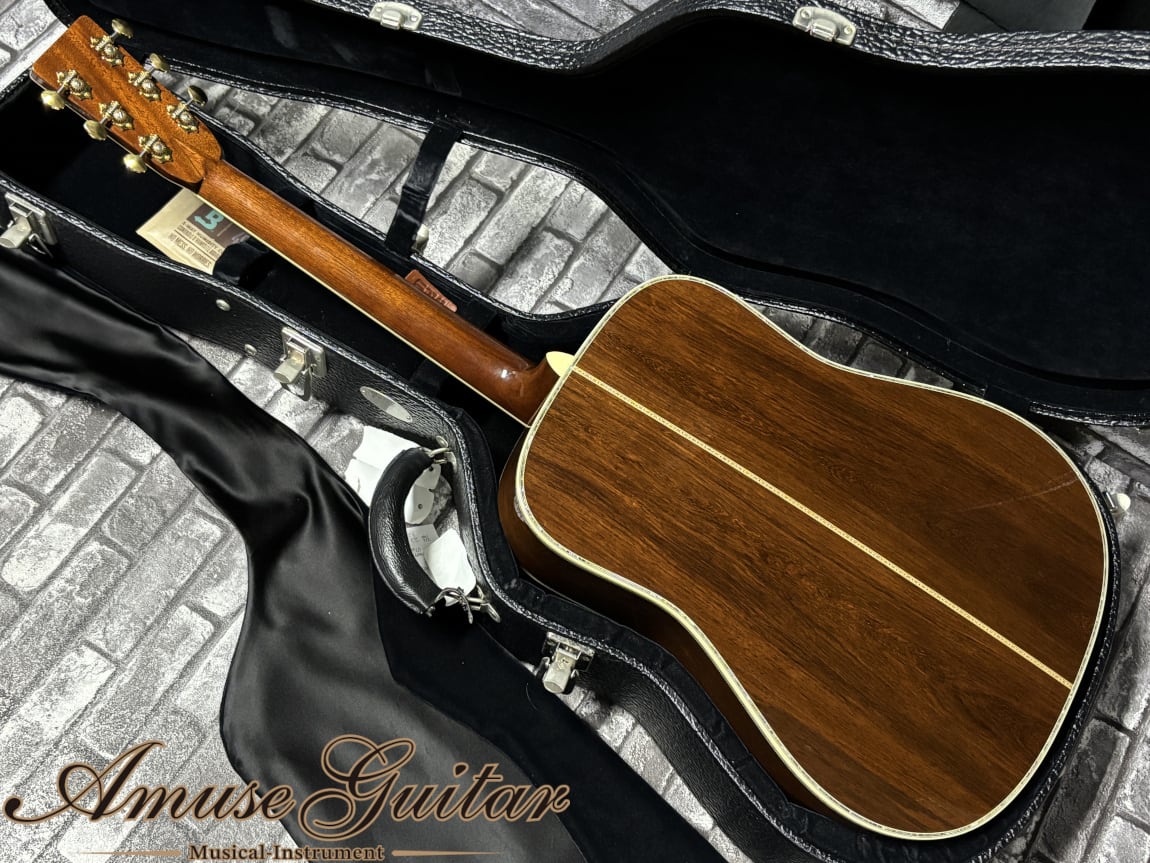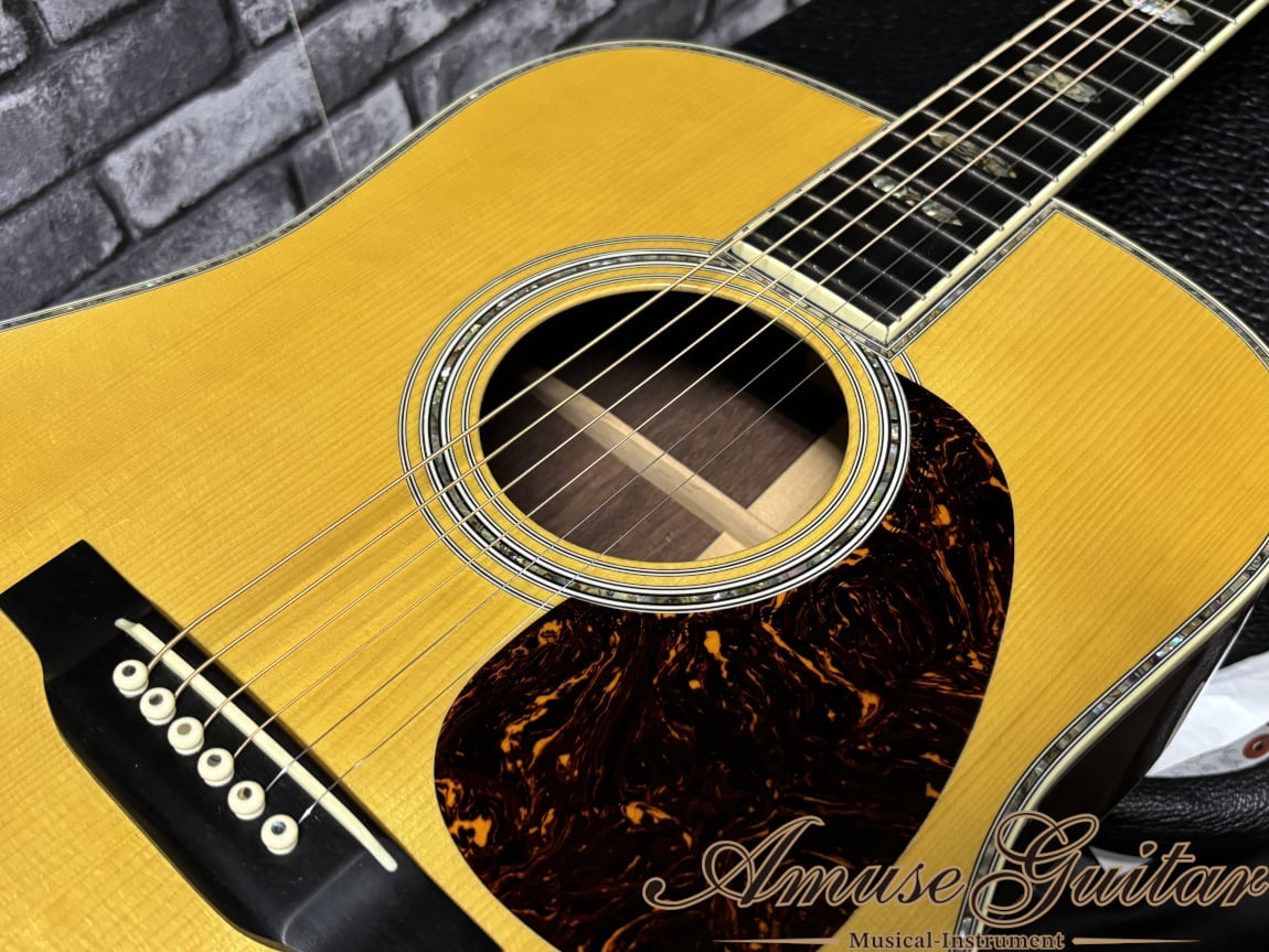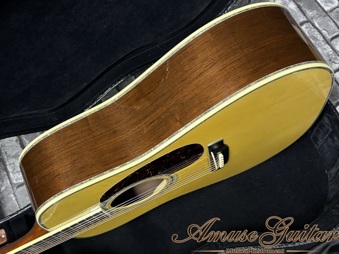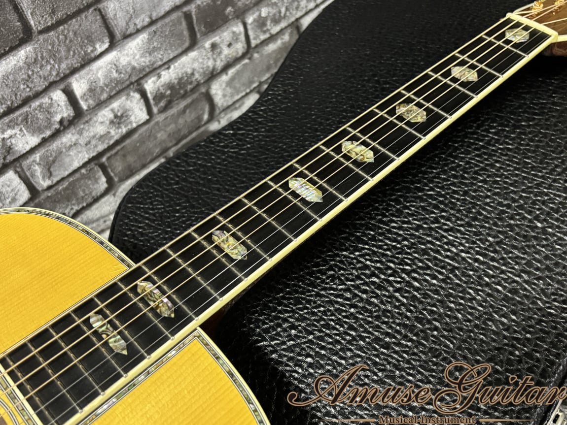 最大の魅力は、ひと目で心を奪う華やかさと、決して派手さだけに終わらない気品の高さ。ボディを縁取るアバロンの輝きは、照明や角度によって表情を変え、ステージではもちろん、手元で眺めているだけでも特別な高揚感を与えてくれます。それでいて、D-45ならではの重厚さと端正さを両立した佇まいは、長い年月を経ても色褪せない“完成された造形美”として成立しているのがさすがの一言です。