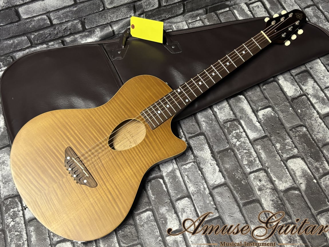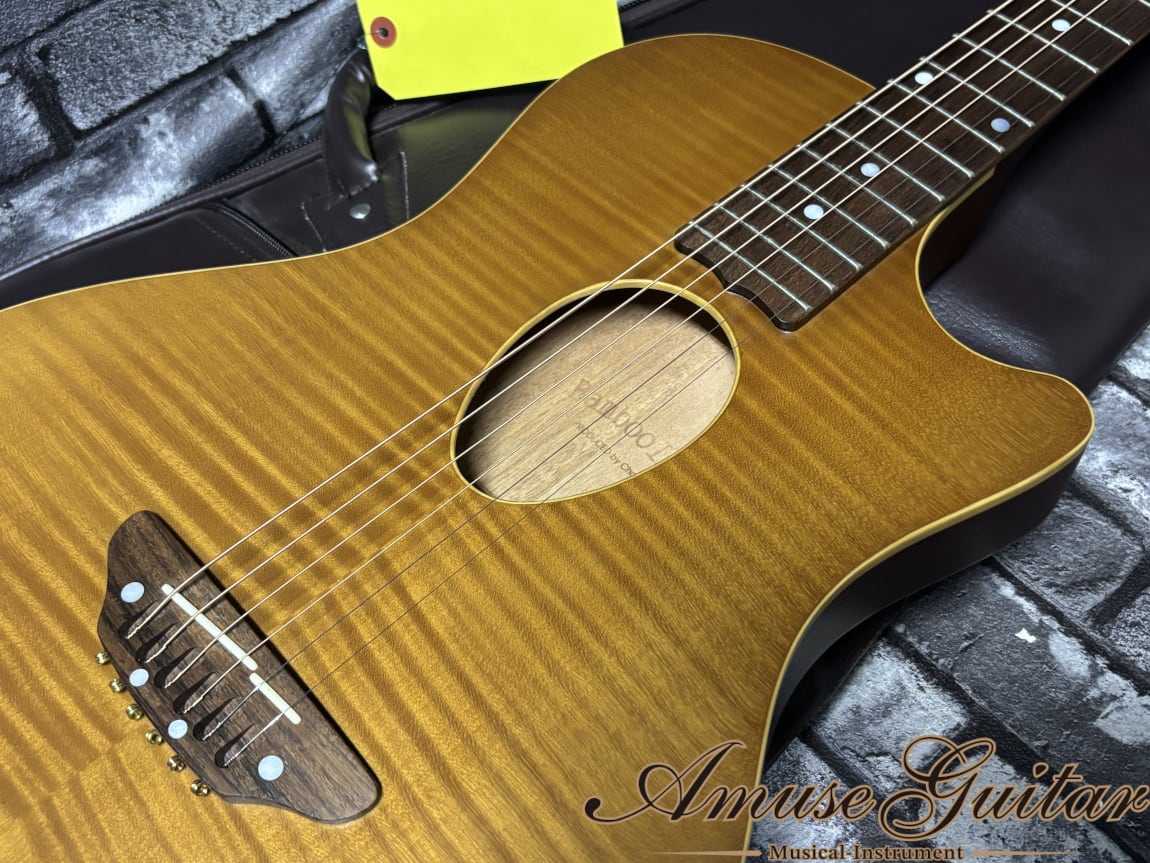 コチラのスペックは単板シダーにフレイムメイプルをラミネートしたトップ/くり抜きのマホガニーバックとなるボディ。マホガニーネックにローズウッド指板の木材マテリアルとなっております。セットネック構造となっており、小ぶりで薄いボディに併せてショートスケールを採用しているポイントが特徴で、ずっと手に持っていたくなるライトな弾き心地が素晴らしいです。音量も大きすぎないので、家用のアコギとして抜群の輝きを放つ設計です。そしてこちらはエレアコ仕様となり、ブリッジ下にピエゾピックアップを搭載。ボディサイドにヴォリュームノブを一つのみ搭載したシンプル設計です。専用のプリアンプを搭載しており、アウトプットサウンドもストレートで扱いやすいサウンドです。