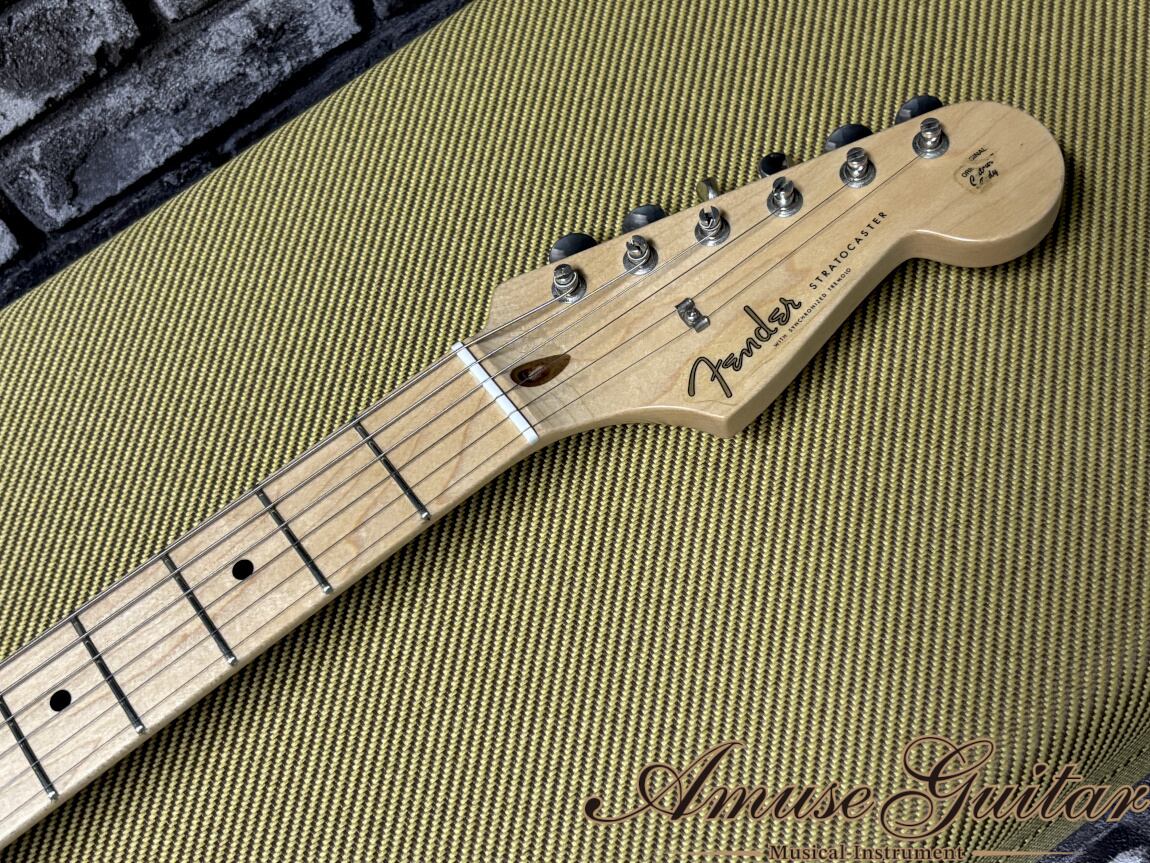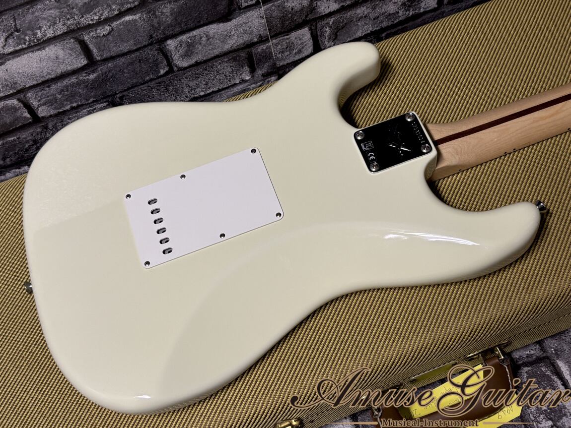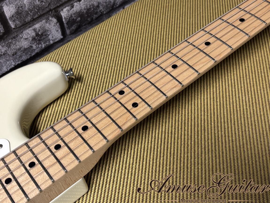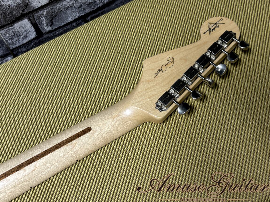 まず人気のスペックとしては、アルダーボディにオリンピックホワイトのグロス仕上げ。ネックには、追い柾目取りでフレックラインも確認できる1Pメイプルネックを採用。8点留めの1Pホワイトガード、スパロゴのスモールヘッドにはシグネイチャーロゴも入れられております。ブリッジは、スプリング×5本張り+ウッドブロックのベタ付け仕様となるシンクロナイズドトレモロユニットです。