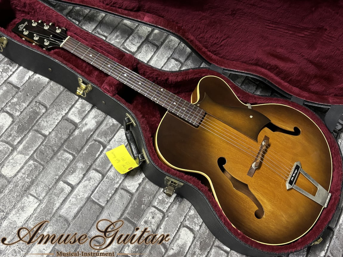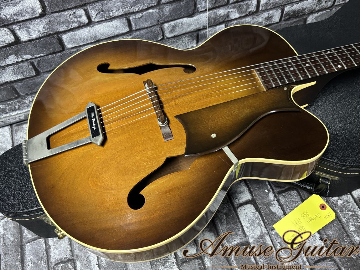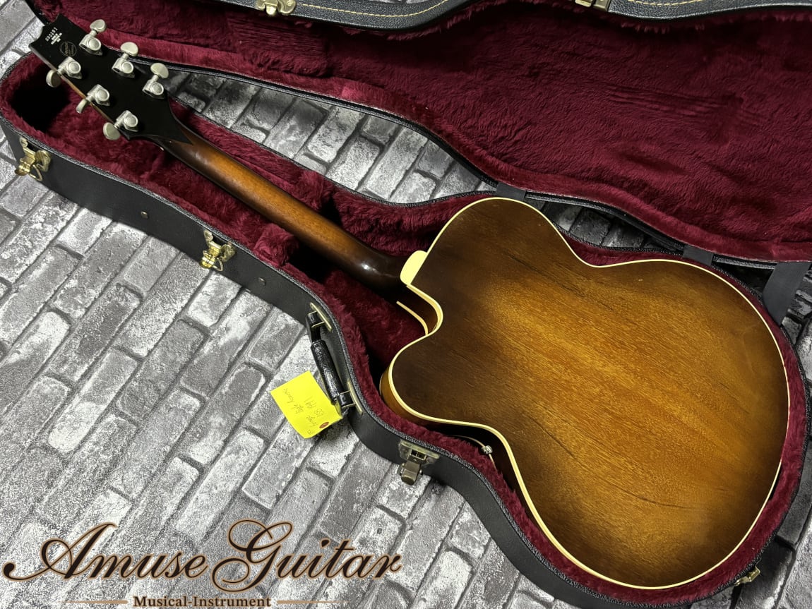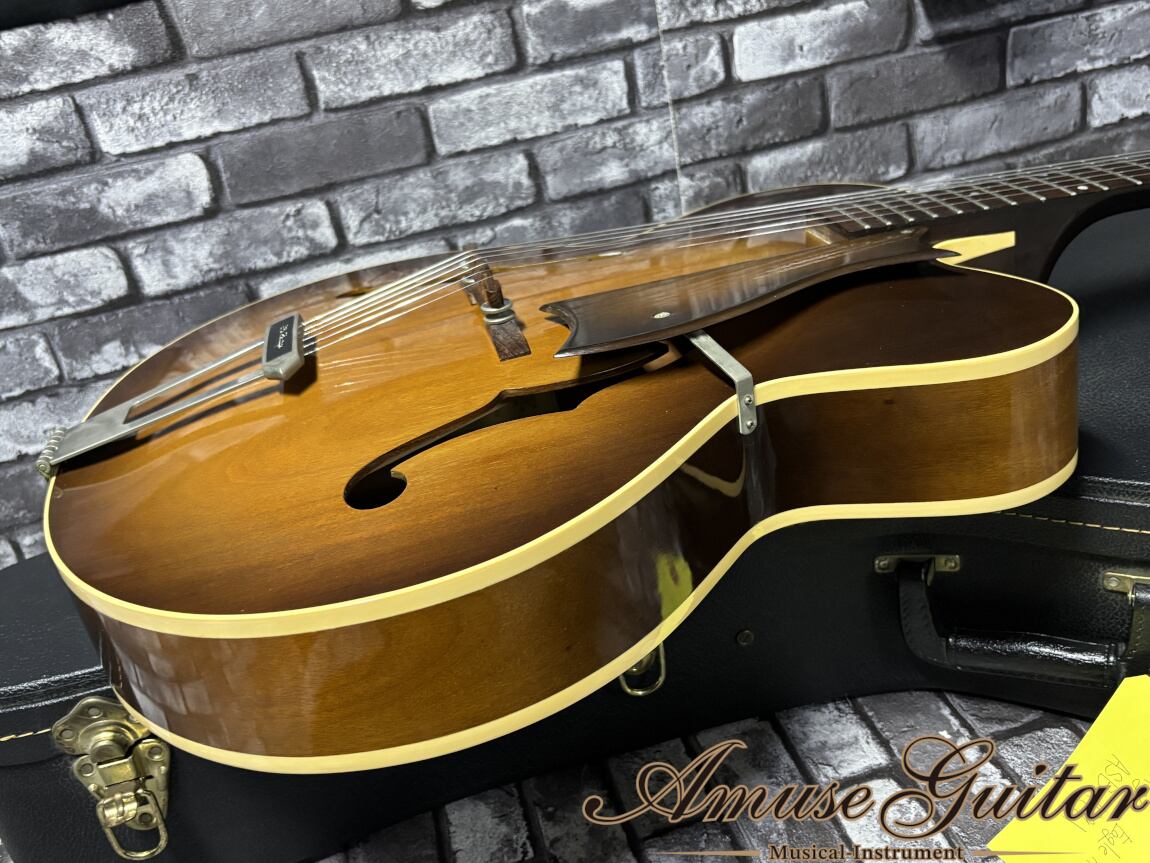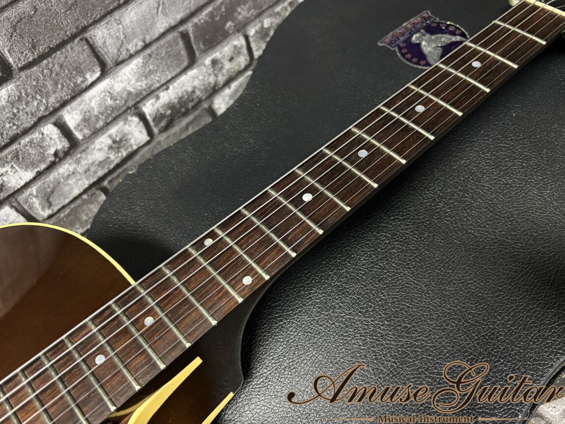 こちらのスペックにつきましてご案内いたします。ボディはオールマホガニー、ネックも1ピース・マホガニーを採用し、指板とブリッジにはローズウッドを使用したウッドマテリアル構成。約640mmスケール、約43mmナット幅、薄めのC〜Uシェイプ、20フレットのセットネック構造となります。幅約17インチ、深さ約3インチのアーチトップ&アーチバックボディは音の立体感が際立ち、しっかりとした音圧と奥行きのある響きが魅力。コードでは芯の太さが感じられ、単音でもふくよかさが残るため、フレーズが前に出てくる印象です。意匠面では、オリジナルヘッドシェイプ、マザーオブパールのドットポジションインレイ、ボディカラーにマッチした塗装が施されたマホガニー削り出しのピックガード、アジャスタブルブリッジ、ロゴ入りオリジナルテイルピース等を装備し、ルックスの統一感も非常に高い仕上がり。アーチトップらしい存在感を存分に楽しめる一本です。