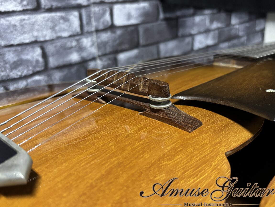 サウンド面は、スウィングジャズやオールドジャズの雰囲気はもちろん、ジャンゴ・ラインハルトを彷彿とさせるジプシージャズ的なアプローチとも好相性。華やかさと乾いた抜け感が同居したトーンは、一般的なフラットトップとは異なる魅力を持ち、“こういう一本を探していた”という方には刺さる内容かと思います。また本機は弦の選択によってキャラクターの変化も楽しめる点がポイント。アコースティックギター弦(ブロンズ系)を張ることで、立ち上がりの輪郭は保ちつつ倍音感が増し、よりアコースティックらしい煌びやかさと空気感のある鳴りを引き出してくれます。反対にフラットワウンド弦を選べば、アタックが丸くなり中低域がより艶やかにまとまり、よりスウィング寄りのトラディショナルな質感へシフト。プレイスタイルや狙うサウンドに合わせて、弦で追い込める懐の深さも本機ならではの魅力です。ており、“こういう一本を探していた”という方にはまさに刺さる内容かと思います。