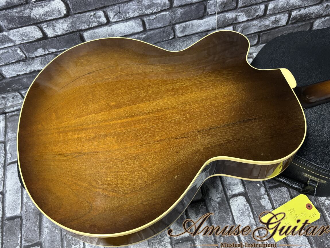 本機「Eagle Acoustic」は、Heritageのラインナップの中でも流通量が極めて少ないレアモデルで、なかなか市場でお目にかかることのない一本です。今回入荷致しました個体はピックアップを搭載しない、いわゆる“ピックギター”的な仕様となっており、純粋に生鳴りと箱の響きで勝負出来る点が非常に魅力。17インチの堂々としたフルボディから生み出される豊かな音量感とふくよかな中低域、そして輪郭の立った立ち上がりは、コードワークはもちろん、単音でのメロディラインも実に気持ちよく響いてくれます。
