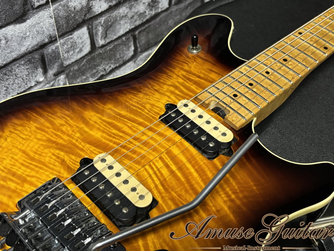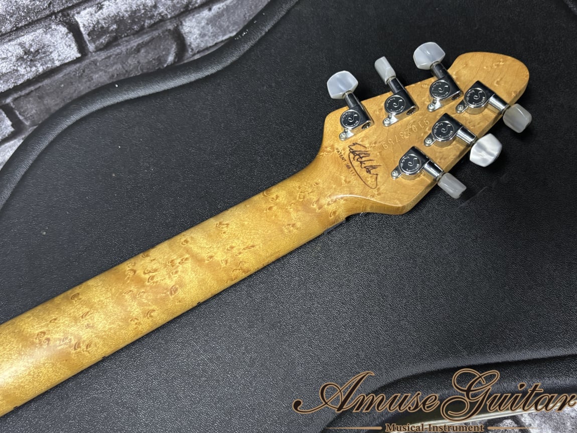 まずそのスペックとしては、バスウッドの3Pバック/目にも美しいキルト寄りのフレイムメイプルトップボディにサンバーストカラーのグロス仕上げにてフィニッシュされ、トップにはアイボリーのバインディングが施されます。カーボングラファイトによって補強されたネックには近年では絶対に手に入らないな・・・と感じさせる強烈なバーズアイのフィギュアドメイプルを採用。もちろん指板は貼りメイプル仕様でこちらにもバーズアイが浮かびます。ネックシェイプは手の形状にあったフィット感良い非対称シェイプ。その他同じ向きに合わされたゼブラカラーのハムバッカーやPeaveyロゴ入りフロイドローズ&ロックナット、D-Tuner、シャーラーチューナーなどが挙げられます。またヘッド裏には本国USAメイドを示す91シリアル、ゴールドロゴ、PAT.PEND焼印、EVHロゴ、またフロイドローズのトレモロブロックをFU-Toneのブラスパーツ、更にアーム部はより細かな表現を可能にすべくアソびの少ないFloyd Rose純正のアーム&ハウジングにアップグレードが施されております。