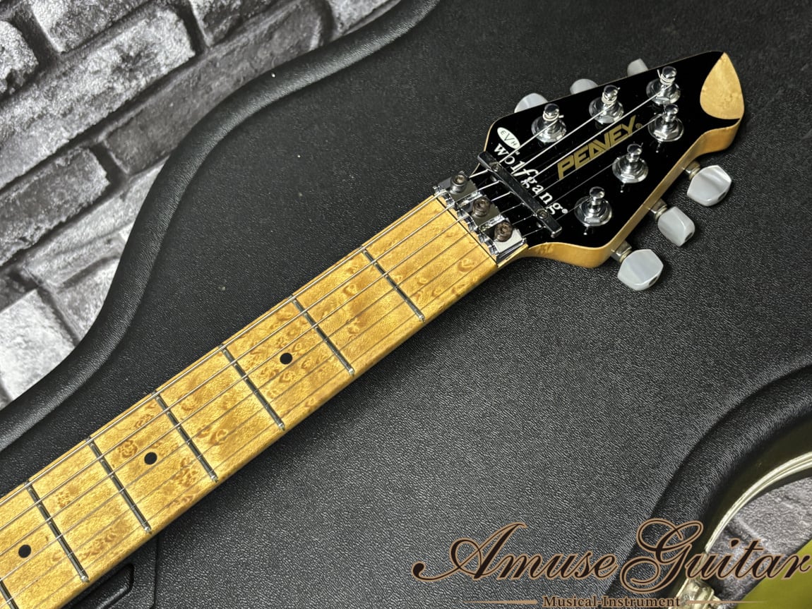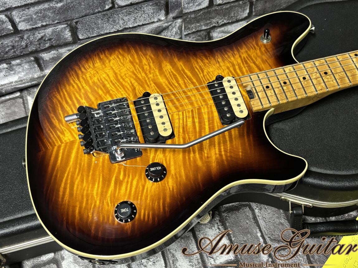 今回ご紹介させて頂きますのは、そのピーヴィーのウルフギャングモデルの中でも特に人気の高いサンバーストモデルです(2000年当時カタログにてAmber Sunburst表記)。当時ライブ等でEddie Van Halen本人が演奏していたことでもファンには強烈に印象に残っているカラーリング。深くワイルドに出た杢目がアーチトップに相まってハイエンドなオーラを放ちます。そして今回の個体はアップグレードパーツが搭載された特別な仕様。ルックス、サウンド共に抜群の逸品です。