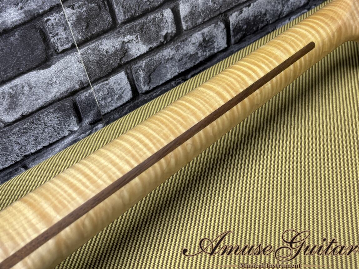 まずその人気のスペックとしては、アルダーボディにブラックフィニッシュのグロス仕上げ。ネックには見るからにサウンドの良さそうな”追い柾目取り” 1Pメイプルを採用しネック全体にはこれでもかと極めくフィギュアドの浮かぶ厳選された素晴らしい材が採用されております。ネッジョイント部には正規代理店取り扱いの印となるYAMANOスタンプと、Herbert Gastelumスタンプを確認。その他としては8点留め1Pホワイトガードに、スパロゴのスモールヘッドにはシグネイチャーロゴも入れられております。
