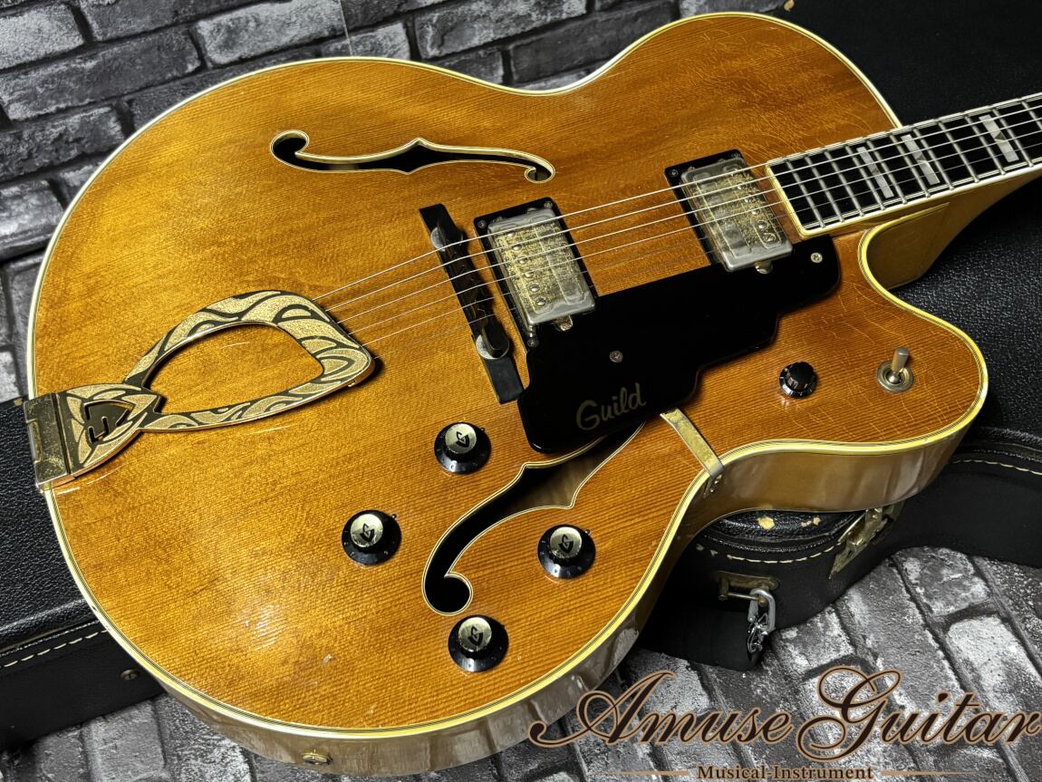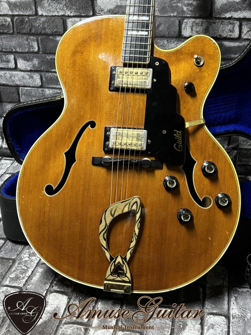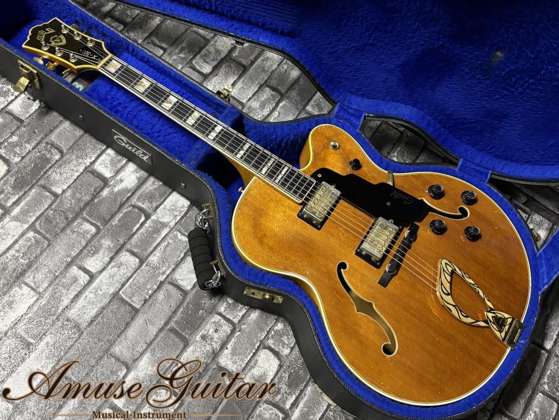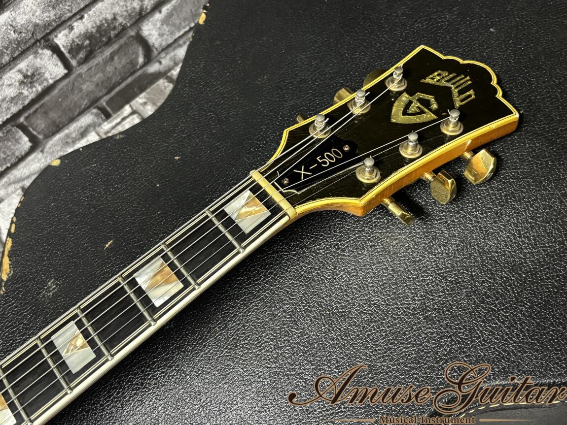 今回ご紹介させて頂きますのは、そのギルドが70年代に製作したフルアコギターX-500です。当時、上位機種として生産され、ジャズ/ブルースギタリストに愛用された名機です。17インチから繰り出される極上の鳴りはもちろん、オリジナル状態は高いまま、プレイヤビリティも優れたオススメの一本です。