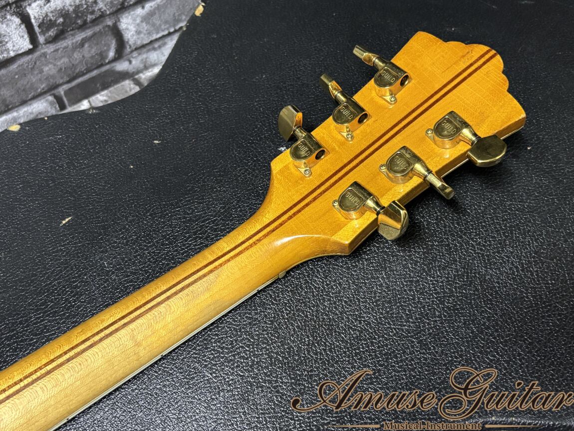 こちらの状態につきまして、指板サイドのバインディングクラック、ウェザーチェックをはじめとした塗装面の経年変化、打痕や擦れなど、製作から約半世紀を経過した個体らしい味わい深い使用感が見受けられます。とはいえ、そうした経年要素もまた、本器が歩んできた年月を物語るものとなっており、ヴィンテージらしい風格をしっかりと感じさせてくれる一本です。プレイヤビリティ面では、演奏性向上のためリフレットおよびリナットが施されており、大きめのフレットが採用されていることで、軽いタッチでもスムーズなフィンガリングが可能となっております。その一方で、その他の主要パーツはオリジナル状態を保っており、ゴールドパーツのメッキも比較的良好に残った印象です。ネックコンディションも問題なく、トラスロッドの動作も正常、フレット残量も7〜8割以上ございますので、今後も安心してお使いいただける実用的なコンディションを維持しております。付属品はGuildロゴ入りのオリジナルハードケースが付属いたします。