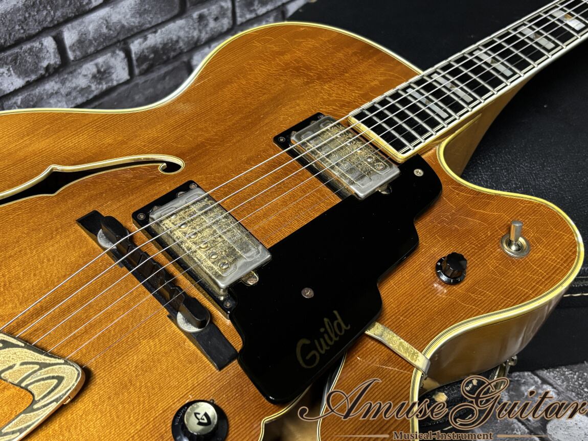 こちらのスペックにつきまして、ボディにはスプルーストップ、サイド&バックには美しい杢目がきらめき、フレックラインも確認できる良質なカーリーメイプルを採用。ネックには剛性に優れた3ピース・メイプル、指板には近年ではなかなかお目にかかれない、真っ黒で艶やかなエボニーを使用しております。スケールは24 3/4インチ(628mm)、ナット幅41.5mm、実測でヘッド角は約13度。14フレットジョイントの20フレット仕様で、グリップは薄めのソフトV〜Cシェイプ。演奏性と伝統的な箱モノらしい佇まいを両立したセットネック構造となっております。そのほか、ヘッドトップのマザー・オブ・パールによるGuildロゴ&モチーフ、”Guild”刻印入りのGrover Rotomaticペグ、“X-500”刻印入りトラスロッドカバー、マザー・オブ・パールのレクタンギュラー・ポジションブロック&アバロン・インレイ、アジャスタブル・エボニー・ブリッジ、手彫り装飾入りのGuild “ハープ”テールピース、バインディング付きFホール、Guildロゴ入りピックガードなど、上位機種にふさわしい豪華な意匠が随所に見受けられます。