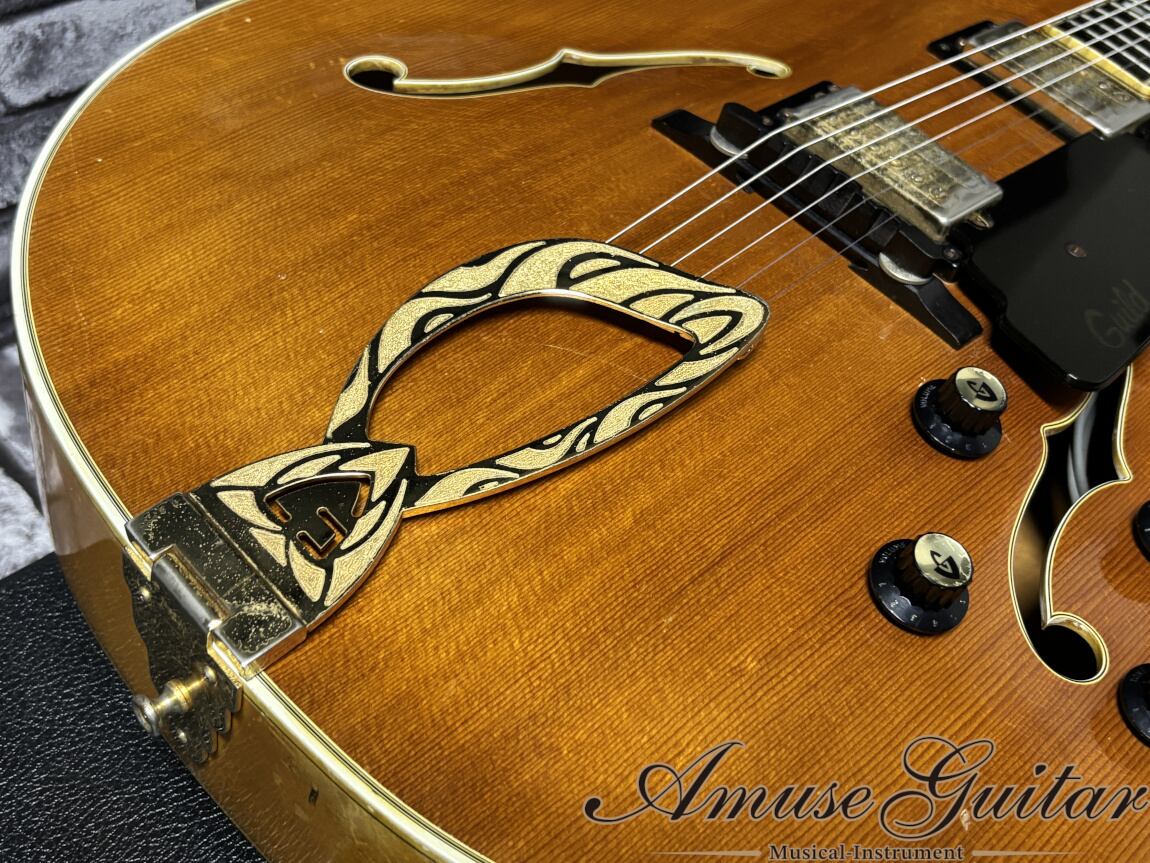 サウンドの要となるピックアップも、オリジナルのGuildハムバッカーをフロント/リアともにエスカッションマウントで搭載。正確なピックアップ位置調整を可能にする3ウェイ・チルト調整機構が採用されているのも嬉しいポイントです。サウンドは、フルアコらしい豊かな空気感とふくよかな胴鳴りをしっかりと感じさせながらも、輪郭は比較的明瞭で、甘く艶やかなジャズトーンから太く芯のあるシングルノートまで上品にアウトプット。フロントでは深くメロウな響き、リアではやや張りのある明瞭なトーン、ミックスでは箱鳴り感とアタック感のバランスに優れた、表情豊かなサウンドをお楽しみいただけます。