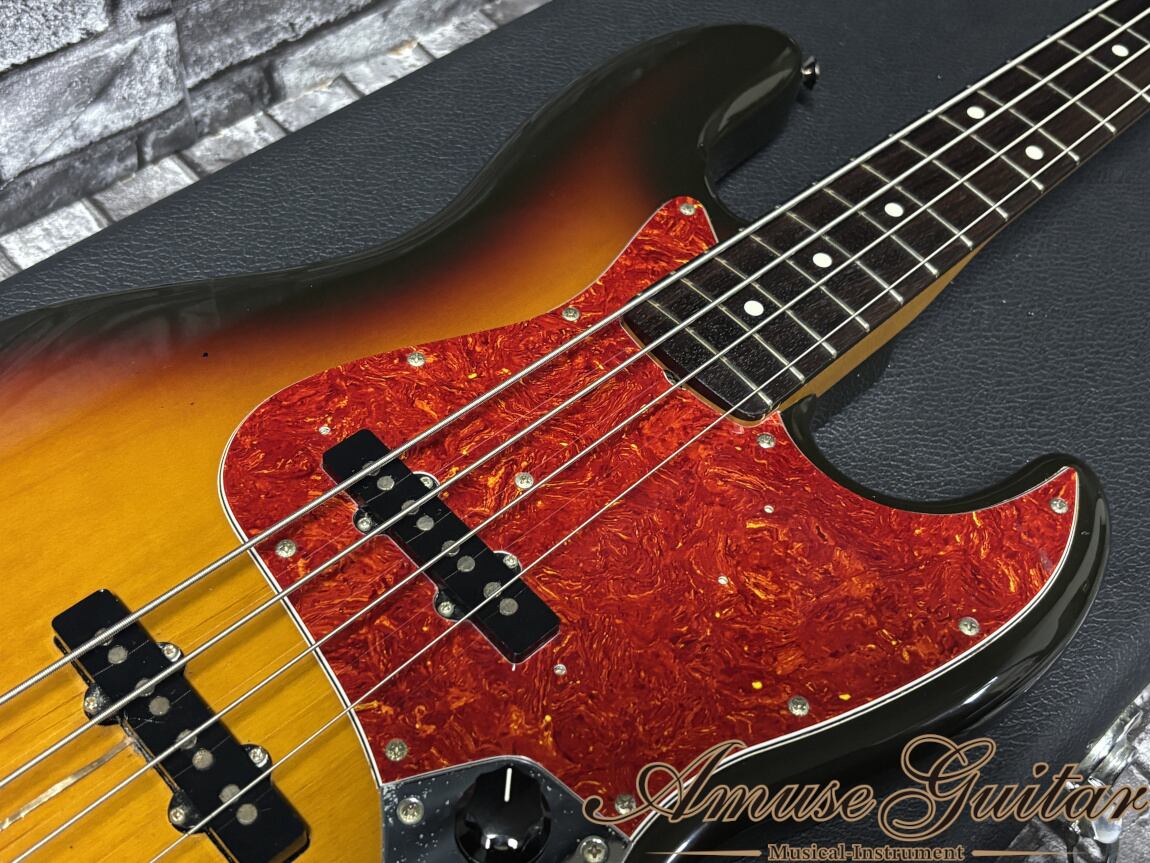 今回ご紹介させていただきますのは、Fenderが1982年に生産を開始した、言わずと知れた日本製シリーズ Fender Japan のエレキベース JB62です。定番であるサンバーストカラーに、アルダーボディ、ローズウッド指板を組み合わせた間違いのないルックスと、高い精度にて評価を受けるモデルです。こちらはフェンジャパの中でも特に評価の高い90年代初頭の一本で、当時のカタログでは【JB62-750】とも表記されていた上位機種にあたります。ピックアップにはオリジナルのFender USA製ユニットを搭載しており、ルックスのみならずサウンド面にもこだわりが感じられる仕様となっております。