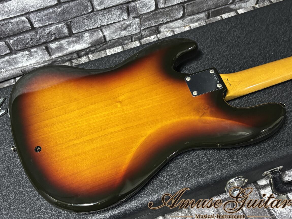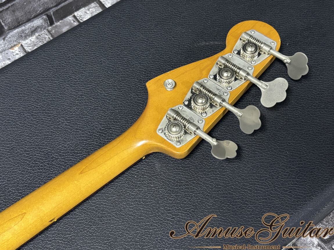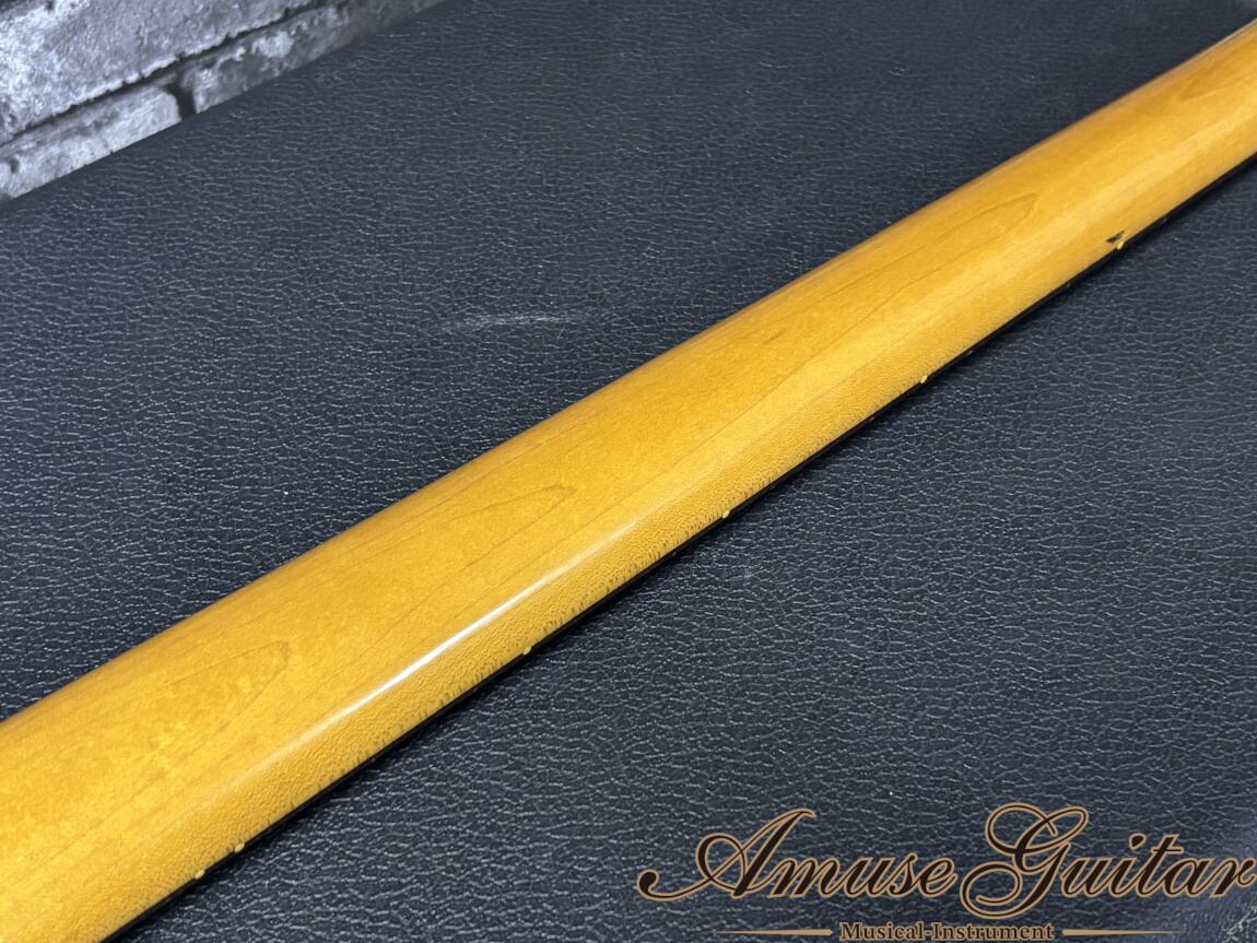 スペックにつきましては、ボディにアルダー、ネックに板目取りのメイプル、指板にローズウッドを採用した、王道かつ間違いのない木材構成です。ロングスケール、38mmナット幅、184R、細めのネックシェイプを持つボルトオン構造を採用。その他、逆巻きヴィンテージスタイルのペグ、ネックエンドに記された1991年製のペンシルデイト、ボディのネックポケット内の“ S ”スタンプ、4弦部に裏通しが可能となる後加工、さらに電装パーツのアップグレード換装(CTS POT、オレンジドロップコンデンサ、Switchcraftジャック)などが特徴として確認できます。