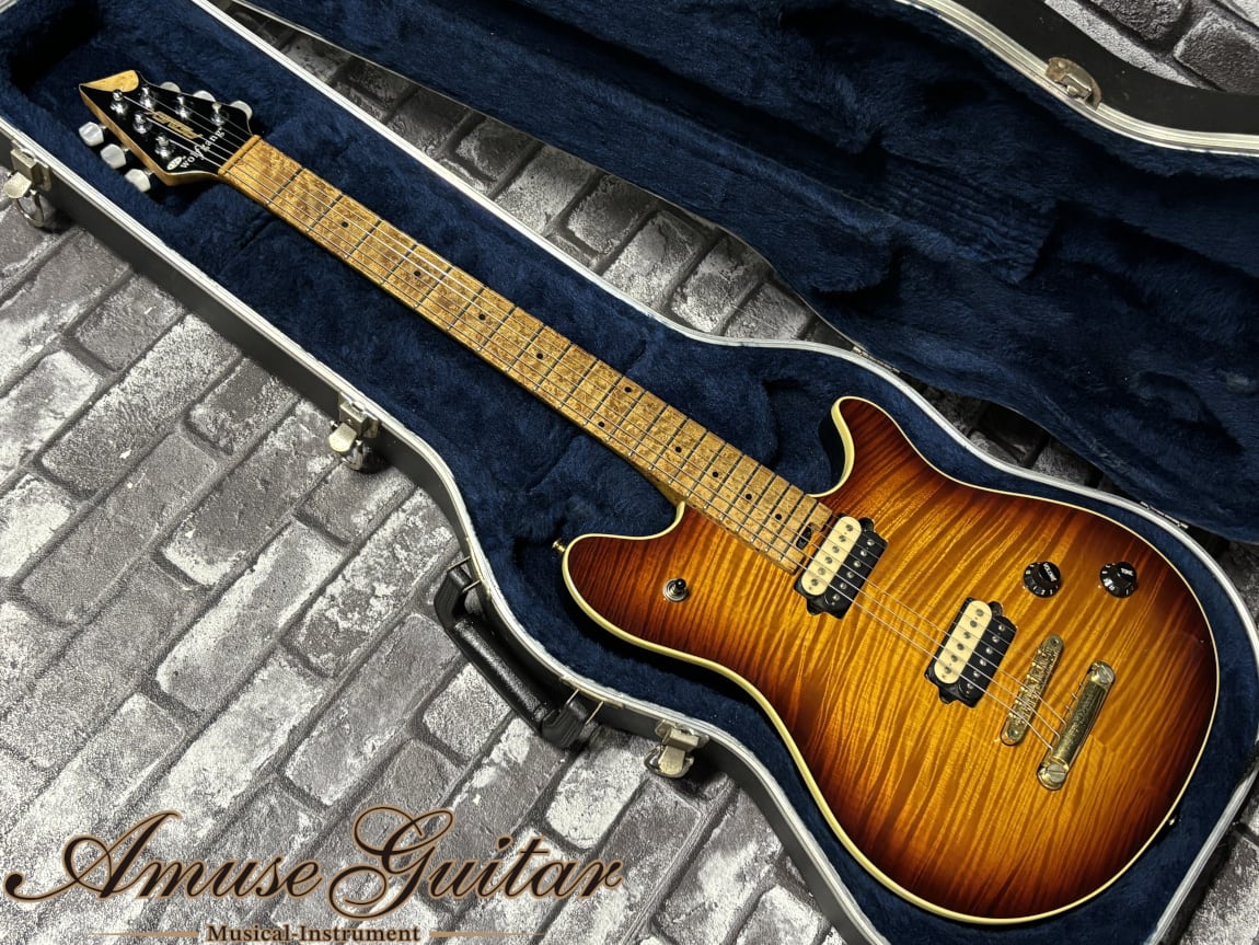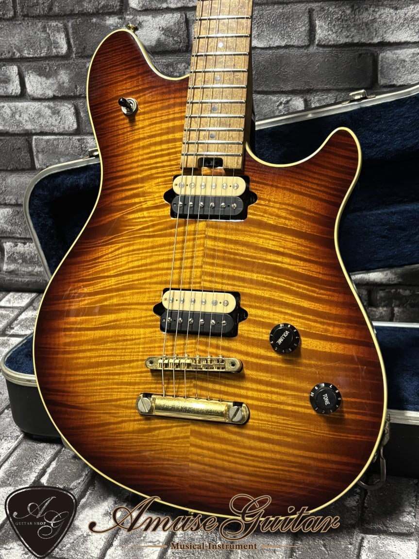 今回ご紹介させて頂く一本は、そのCustom Shopの中でも最も人気の高いEVH Wolfgang Custom Deluxeの2004年製。ファーストオーナー様が2003年に直接オーダーした逸品にて、極上のフレイムトップにワンオフカラー、歴代のEVHモデルの中でも最高峰となるバーズアイとフレイムの混在する強烈なフィギュアドネック、チューナーのみをクロムカラー、その他をゴールドに統一したレアなハイブリッド・ハードウェア、チューンOマティックのノントレ仕様と、この世に一本のみとなる、まさに唯一無二のEVH Wolfgang。更には市場に一度も出回った事の無いワンオーナー&オリジナル度の高い一本になります。
