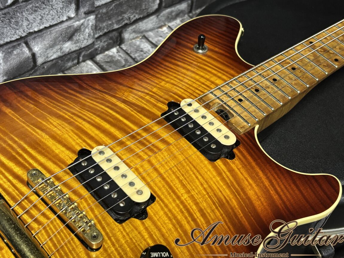 特注オーダーのCustom Deluxeモデル。極上フレイムトップ、強烈なバーズアイ&フレイムネック、ゴールドパーツのノントレ仕様、ワンオフカラーと唯一無二の一本。ワンオーナー&ほぼフルオリにて入荷致しました。