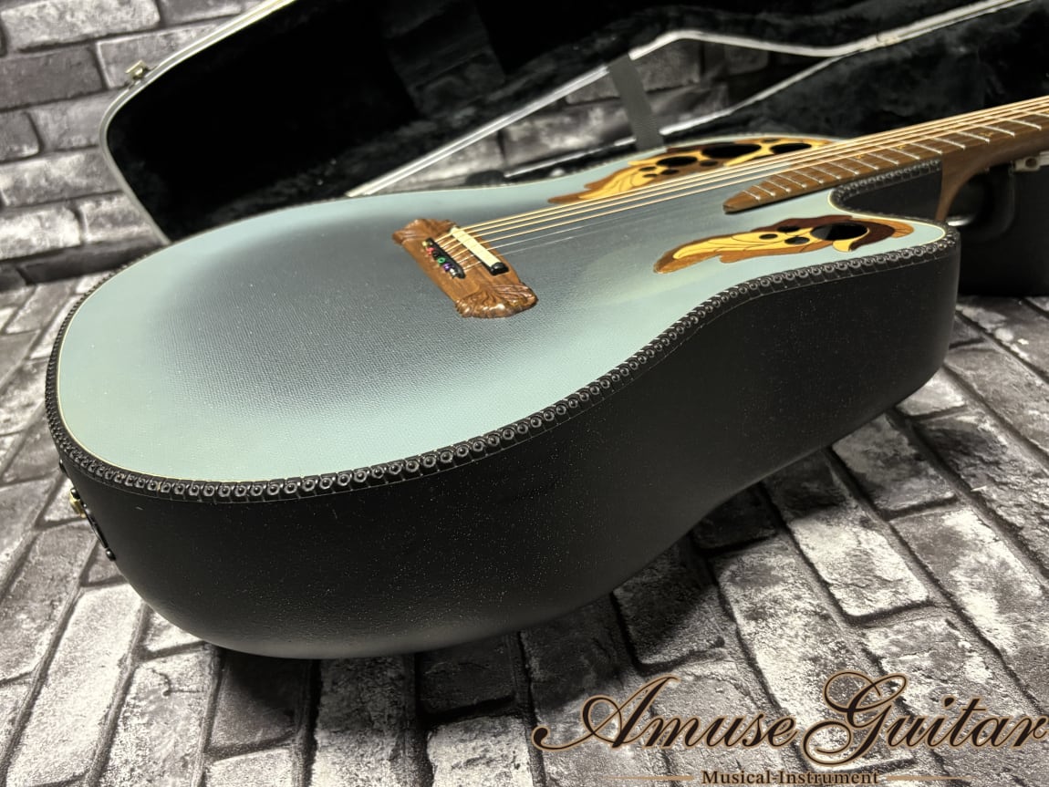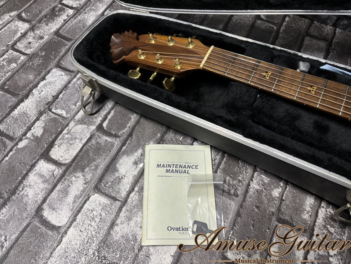 こちらの状態ですが、パーツ類に若干の経年変化やヘッド部の打痕は確認できるものの、全体として大きく目立つダメージは少なく、1995年製という年式を考慮すればかなり良好なコンディションをキープしております。ネックにつきましては、極々僅かな波打ちこそ見受けられますが、ほぼストレートの状態にて、全ポジションでの発音も確認済みでございます。演奏面において大きな問題はございません。トラスロッドにつきましては締め方向・緩め方向ともに非常に硬く、固着と思われる症状が見受けられます。また、プリアンプ部のチューナーにつきましては、この時期の個体にありがちな症状として動作いたしませんが、その他の機能は問題なくご使用可能です。現在サドル下のシムは入っておりません。付属品は新品購入時付属のオベーションマニュアル、オリジナルハードケースとなります。