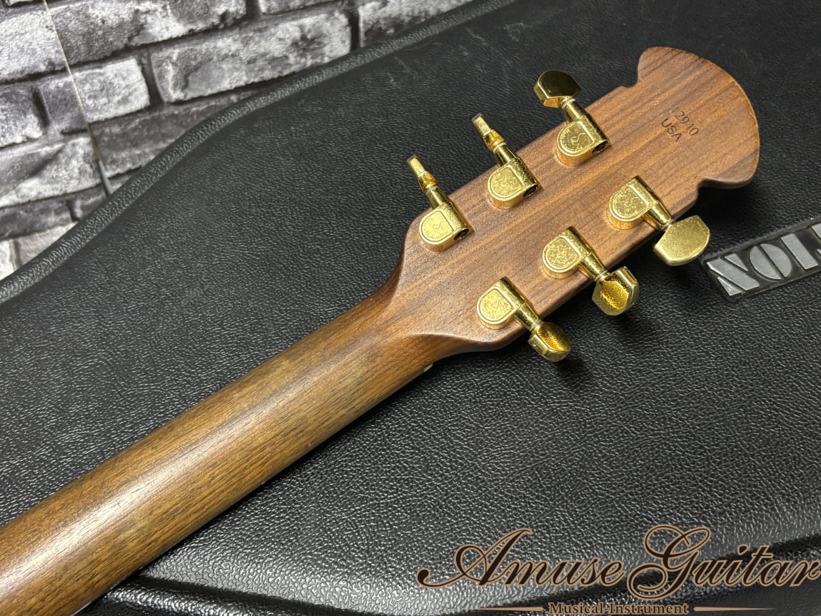 こちらのスペックですが、ネックにはAdamas Iらしいウォルナットネックを採用し、指板も同じくウォルナット仕様。ナット幅は1 11/16インチ(約41.3mm)、14フレットジョイント、スケールは25 1/4インチ(約641mm)、24フレット仕様となっております。トップにはAdamasの代名詞とも言えるカーボングラファイトトップを採用し、ブレイシングはAdamas Fan Bracing。ボディはオベーション独自のRoundback構造で、本モデルは深みのある鳴りが魅力のDeep Bowl仕様です。ピックアップにはピエゾエレクトリック・スチールストリング用ユニットを搭載し、プリアンプはOPTIMAを採用。さらに、24Kゴールドメッキのマシンヘッド、8つのメイプルインレイ、彫刻的な意匠が施されたウォルナットブリッジ、そしてAdamasを象徴する左右対称のウッドエポーレットも本モデルの大きな特徴です。ヘッドのスクロール調デザインとブリッジの彫刻的な造形は、単なる装飾に留まらないSuper Adamasならではの風格をしっかりと演出しております。