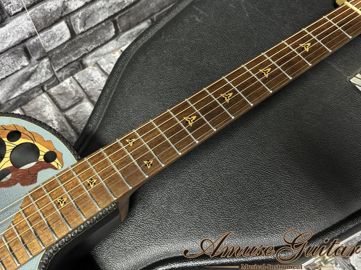 こちらのサウンドですが、スーパーアダマスならではのレンジの広さと、深みのある鳴りがまず印象的です。カーボングラファイトトップ特有の立ち上がりの良さに加え、Deep Bowlならではの豊かな箱鳴りがしっかりと感じられ、単なる“Ovationらしいエレアコサウンド”に留まらない、ワンランク上のスケール感を持ったサウンドに仕上がっております。低音域は量感がありながらも輪郭を失わず、中高域にはアダマス特有の艶やかさと抜けの良さがあり、コードストロークでは広がりのある立体的な響き、フィンガーでは繊細なタッチニュアンスまでしっかりと拾い上げてくれます。生音の完成度はもちろん、ライン出力時においてもそのレンジ感と分離の良さは健在で、ステージユースにおいても非常に高い実力を発揮してくれる1本です。オベーションの中でも最高峰と称される理由を、ルックスのみならずサウンド面からもしっかりとご体感頂ける仕上がりと言えるでしょう。