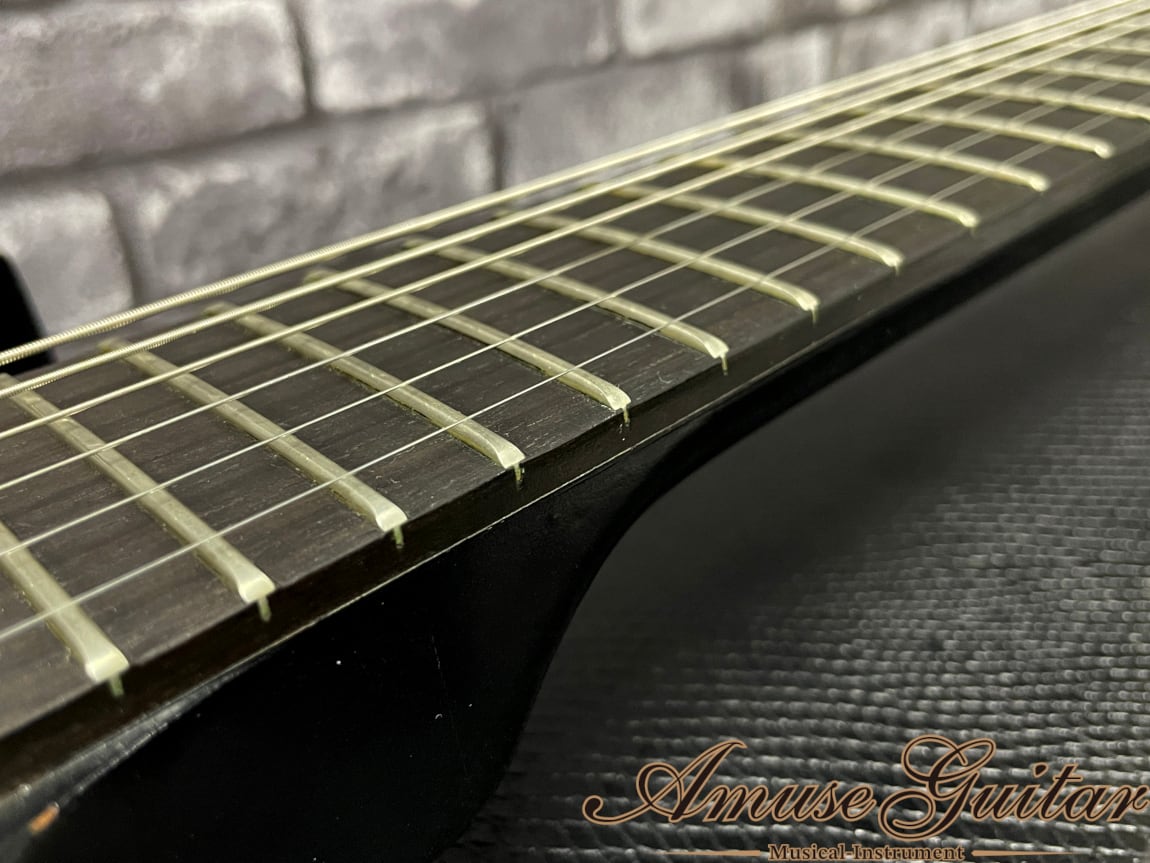 サウンドの要となるピックアップにはフロントにEMG 85、リアにEMG 81という黄金コンビをマウント。軽めのボディウェイトとは思えない地鳴りのような音圧を誇り、クリーンでもドライブでも切れ味優れた立ち上がりを保ちつつ、優れたサウンドバランスを誇ります。ルックスにマッチしたダークなサウンドはもちろん、輪郭をハッキリと感じられるサウンドレンジはダウンチューニングでの演奏もシッカリとカバーできるポテンシャルを秘めた一本です。ズンズンと巻き弦の鳴りを感じられるHR/HMなリフなども相性抜群です。