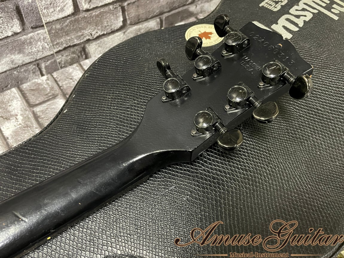 こちらの状態としましては、打痕、スレ、スタンド長期立てかけによるボディ/ネックの塗装ダメージ、使用によりマット塗装部に艶が出ている経年など、所謂プレイヤーズコンディションではございますが、弾きこまれ、成熟しきったボディ鳴りは逆に長所と感じるポイントです。ネック折れ補修などの致命的なダメージは無く、併せて演奏に支障のある部分はございません。ノブ×4が交換されております。フレットも全体的にみて6~7割以上残り、トラスロッドも余裕がしっかりございます。付属はオリジナルのギブソンブラックケースです。※取手の紛失、鍵部分の破損がございます。