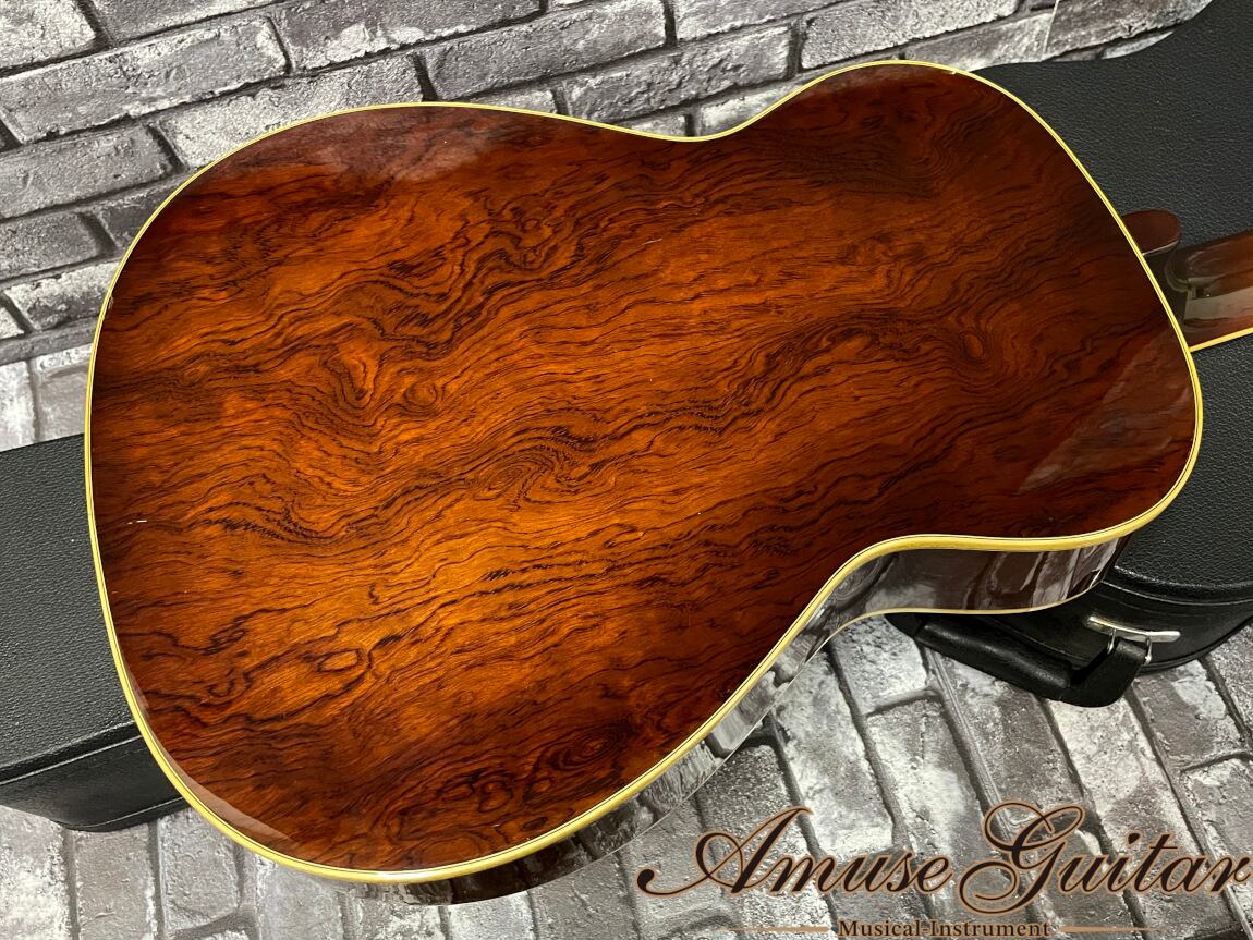 気になるサウンドですが、驚愕の激渋ブルース/カントリーの泥臭さを前身で感じることができる圧巻のリゾネーターサウンドです。フルアルミボディのリゾネーターと比べアコースティックギターの良さがミックスされているのですが、通常エレキベースに多く用いられるブビンガをボディに使用する事により他を寄せ付けない圧倒的なロングサスティーンと、弦の生き生きした跳ね返りを大音量にて放出します。通常アコギスタイルは勿論、是非この個体はスライド奏法にて唸らせて頂きたいなと直感的に思える大迫力サウンドです。