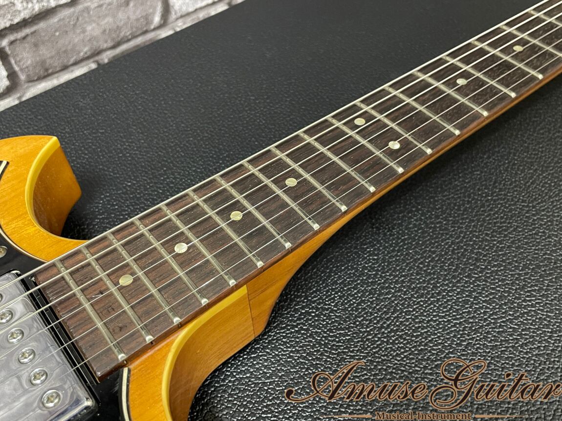今回ご紹介させて頂きますのは、そのYAMAHAのSGシリーズの中でも珍しいSG-70でございます。サンタナ氏の開発協力により今のアーチトップ&ダブルカッタウェイSGシェイプが定着する以前のモデルとなっており、ボディ全体を覆うピックガードと、フラットトップのボディが特徴です。70年代中期の個体となりますが、この頃から製作のクオリティは非常に高く、YAMAHAの黎明期を支えたモデルだという事を感じ取れます。