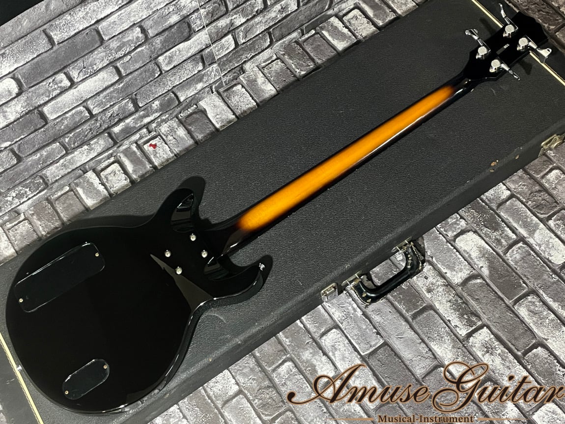 こちらスペックとしましては立ち上がりの良いサウンドと、優れた剛性の両立を誇るハードメイプル3Pネックに、厳選された漆黒と言っても過言では無い真っ黒なエボニー指板。ボディは木目の整ったホワイトアッシュ。タバコバーストカラーが最大限に映える木目がクールなマテリアルとなっています。プロトタイプの製作段階では【ハードロックメイプルトップ&ホンジュラスマホガニーバック】だった本機ですが、J氏の要望により更なるヘヴィボトムを追求。最終的にこの木材マテリアルとなった経緯があります。その他としましては24フレットのみのポジションマークインレイや、ボディバックの通称”Jカット”と呼ばれるボディにフィットするライブユースを考えて考案された特殊加工など、アーティストモデルならではの踏み込んだ仕様が光ります。サンバーストフィニッシュに関しても、「渋めのカラーのTVBモデル」というイメージのJ氏からのオーダーで、カラーサンプルの製作に半年の期間を要し、カラーの選択からサンバーストの吹き方にいたるまで、細かいミーティングを重ねて完成した究極にこだわりぬいたフィニッシュとなっています。