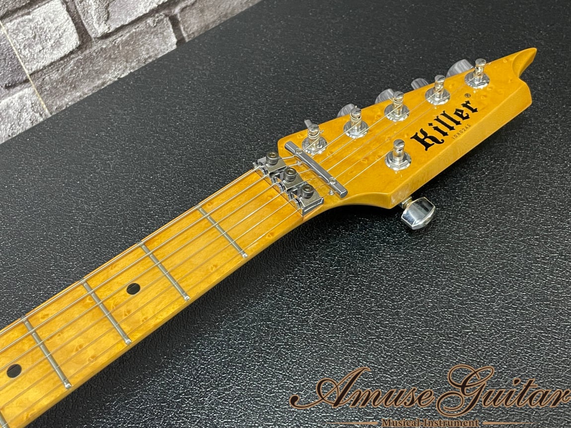 サウンドの要となります搭載ピックアップにもキラーオリジナルの拘り様。フロントにLQ-500、リアにDyna-Biteを採用。爆音/轟音のディストーションサウンドにも埋もれない抜群の音ヌケが特徴です。Dyna-Biteのヘヴィな音像を保ちながら、巻き弦の金属的な鳴り/生き生きとしたサスティーン、中音域の太さを持たせながらシャープな立ち上がりが素晴らしく、キラーリフを奏でるには最高のマッチングと言えるでしょう。フロントのLQ-500のスピード感ある立ち上がり/解像度の高いキラキラとしたプレゼンスも超一級で、スラッシーな速弾きの一音一音を逃すことなくアウトプット。ホワイトアッシュ材からくり出されるコシとパンチの効いた低音に絡みつき、耳に痛いキンキンとしたポイントは感じづらくなっており、この個体との相性は抜群です。高崎晃氏が監修したKillerオリジナル・ピックアップの徹底した拘り、そして最高の木材、最高のパーツ、最高の機構が絡み合った計算されつくされたサウンドがこの一本で体感できます。
