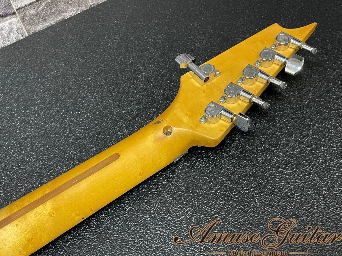 こちらのスペックはボディには厳しく選定されたホワイトアッシュ材を採用、剛性の優れたハードメイプル1Pネックには美しいバーズアイの杢目がしっかりと確認できます。2000年代前半頃までは採用されていた1Pネックですが、材の枯渇により確保が難しく希少なスペックとなります。ボルトオン構造ではございますが、ネックエンド部がフロントピックアップ下まで伸びたディープインサート方式を採用する事により、まるでセットネックの様なサスティーンと、ボルトオン構造独特の発音の良い歯切れが非常に心地よく唯一無二のサウンドバランスを誇ります。ボディトップ面に角度を持たせた【アングルド・ボディ・トップ】を採用しており、他のギターでは体験できない演奏時のフィット感/ストレスの無さも大きな特徴の一つです。その他としましてはESP Random Star等にも採用されておりますSchaller M6 MINIペグを5:1にて搭載。ボディ裏ジャック部分はエンドピンにシールドをかけられ、演奏の邪魔にもなりにくい位置に計算された角度となっています。