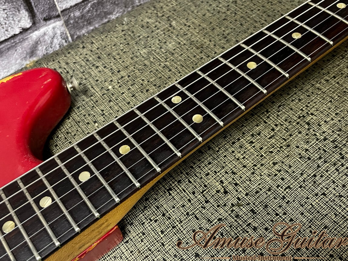 今回ご紹介させて頂くのは、CBS買収後となり他の年と比較しても生産数の少ない1966~1967年製のMustang。半世紀以上前に製作され、時の経過とロマンを感じる圧巻のリアルエイジングルックスに加えて、PU,POT,ハンダバージン等の主要な部分のオリジナル度の高い状態。更にはボディ材にはアルダーが採用された生産数の少ないサウンド抜群の一本になります。