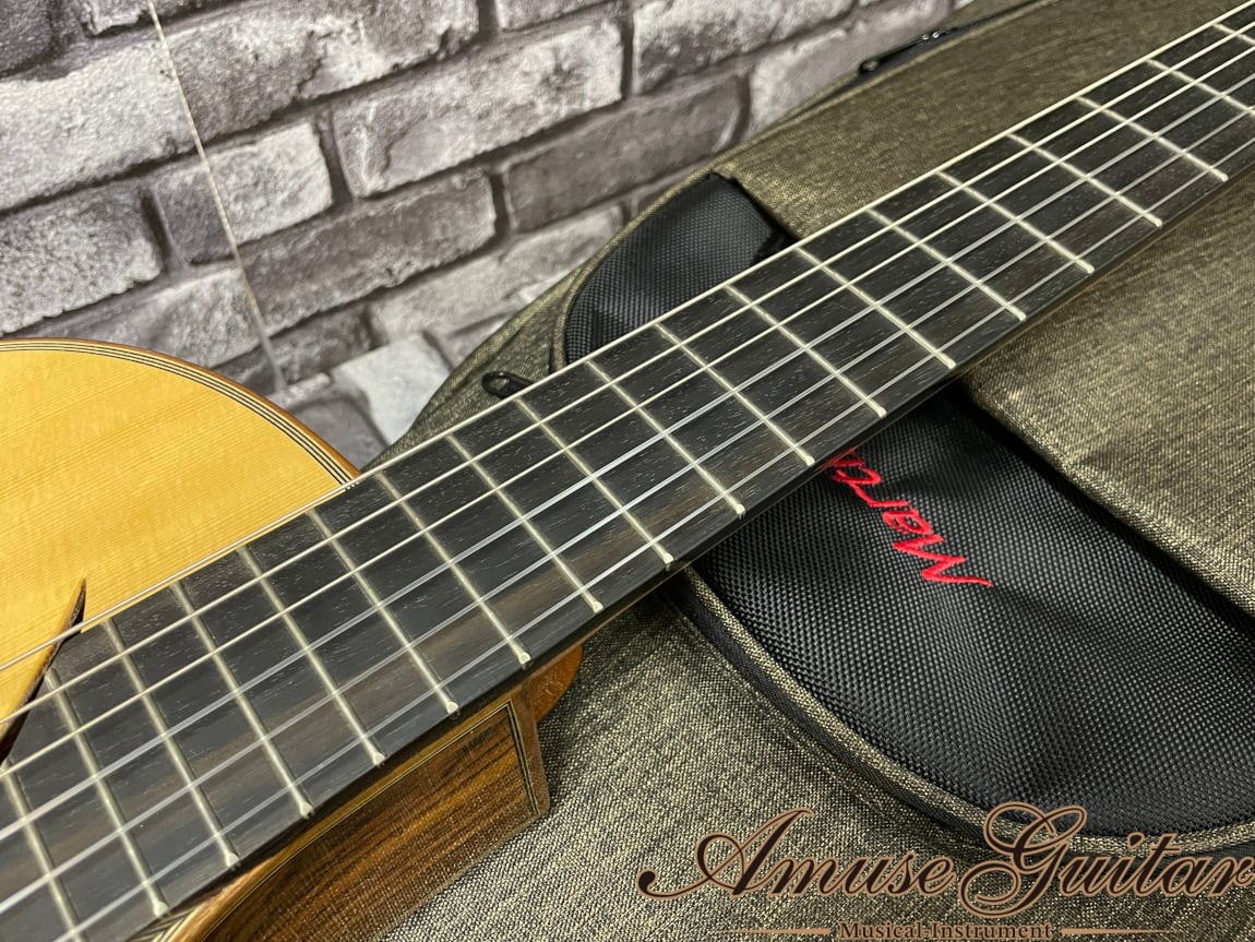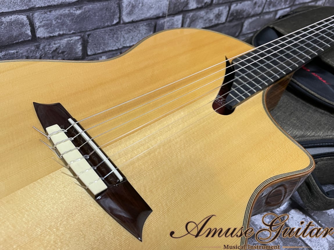 気になるサウンドですが、ボコーテ材の硬質かつ、甘く豊かな中音域の伸びが心地よい鳴りとなっています。キレのあるスパニッシュプレイから、叙情的でクラシックスタイルの演奏にも追いついてくる様な表現力の深さも兼ね備える優秀なサウンドバランスです。FISHMAN Presys Blendを搭載しており、アウトプットでの手元による直感的な操作も可能。どの現場でも使える、プロフェッショナルで頼もしいピックアップです。ハウリングの起きにくいトータル設計により、プラグインした宅録はもちろん、ステージ下での使用も想定されているので、多用途を想定されているプレイヤーの方にもマッチングする優れたポテンシャルを持ちます。