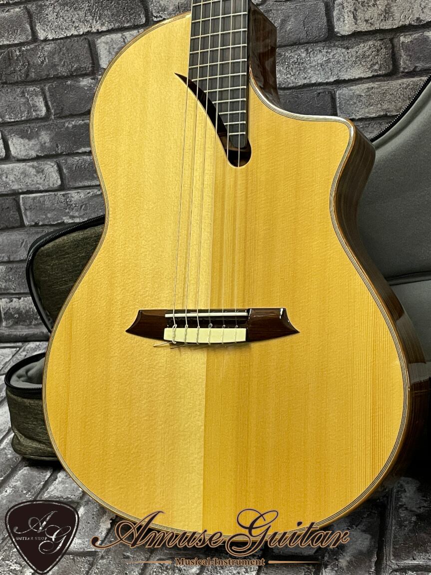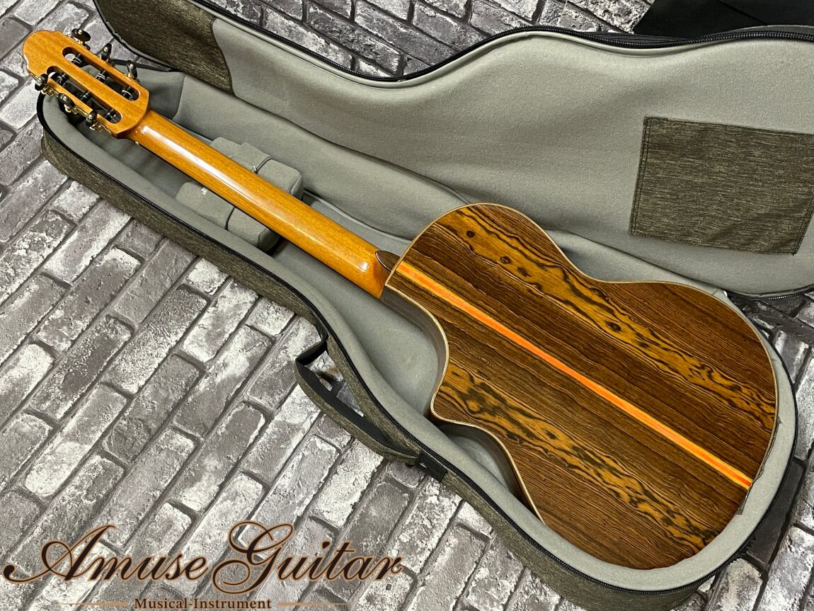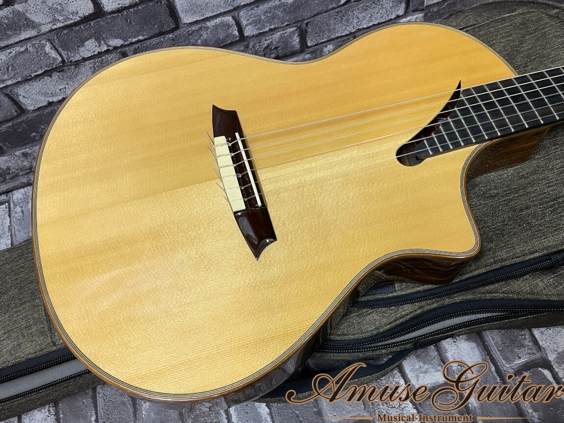 こちらのスペックはネックにマホガニー、指板には黒々としたエボニー、ボディトップにスプルース、そしてボディバック&サイドにはボコーテ材を採用。この高級感あふれるエキゾチックな木目も優れたボコーテ材を採用したものは特別オーダーモデルのみとなっており、大変珍しいスペックとなっています。ハウリング防止のためトップ面のサウンドホールはネックエンドのデザインに合わせて小さめに加工され、ショルダー部に空いたホールはプレイヤーのモニターとして鳴りを伝える優れた機能性/デザイン性をもちます。ボディ厚も約72mmと、薄く小ぶりに設計されておりプレイアビリティも抜群です。その他としてはナット幅48mm、スケールは650mmとなります。