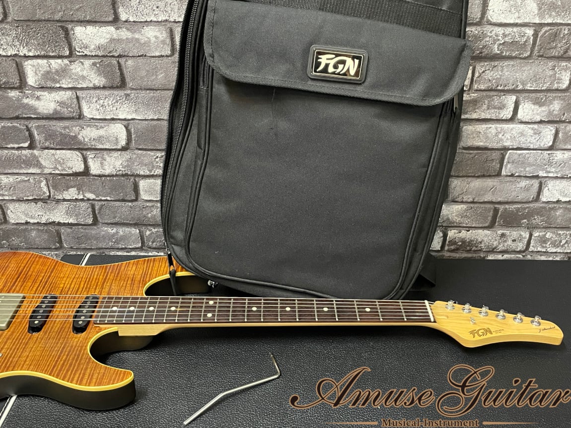 気になる状態ですが、塗装チップ、ボディの打痕/スレ、ピックアップカバーのくすみは確認できますが、ボディトップに目立ったダメージは無く、その他パーツの使用感も少なく綺麗な印象です。換装されたペグエクストラホールは丁寧に穴埋め済みです。ネック状態も良好となっており、トラスの余裕も確認済み、フレットの残りも7~8割残りでまだまだ使用できます。付属品はFGNロゴ入りのオリジナルGIGケースです。