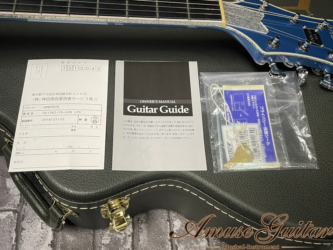 また状態としても、ボディバックに細かなスクラッチと、ポツ打痕が見受けられるものの、その他は特筆するようなダメージは殆ど無く、前オーナー様が大切に扱われていた事が伺えるニアミントコンディションをキープしております。プレイ面としてはネックコンディションは良好でトラスロッドも左右共にシッカリと余裕があり、フレットは大きな凹みも無く9部山程残っております。付属品は神田商会発行保証書、オーナーズマニュアル、レンチ類、オリジナルのグレッチロゴ入りハードケースとなります。