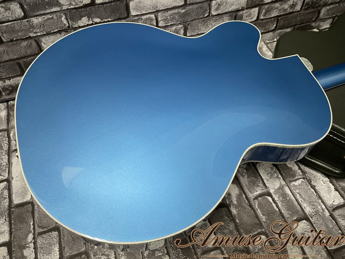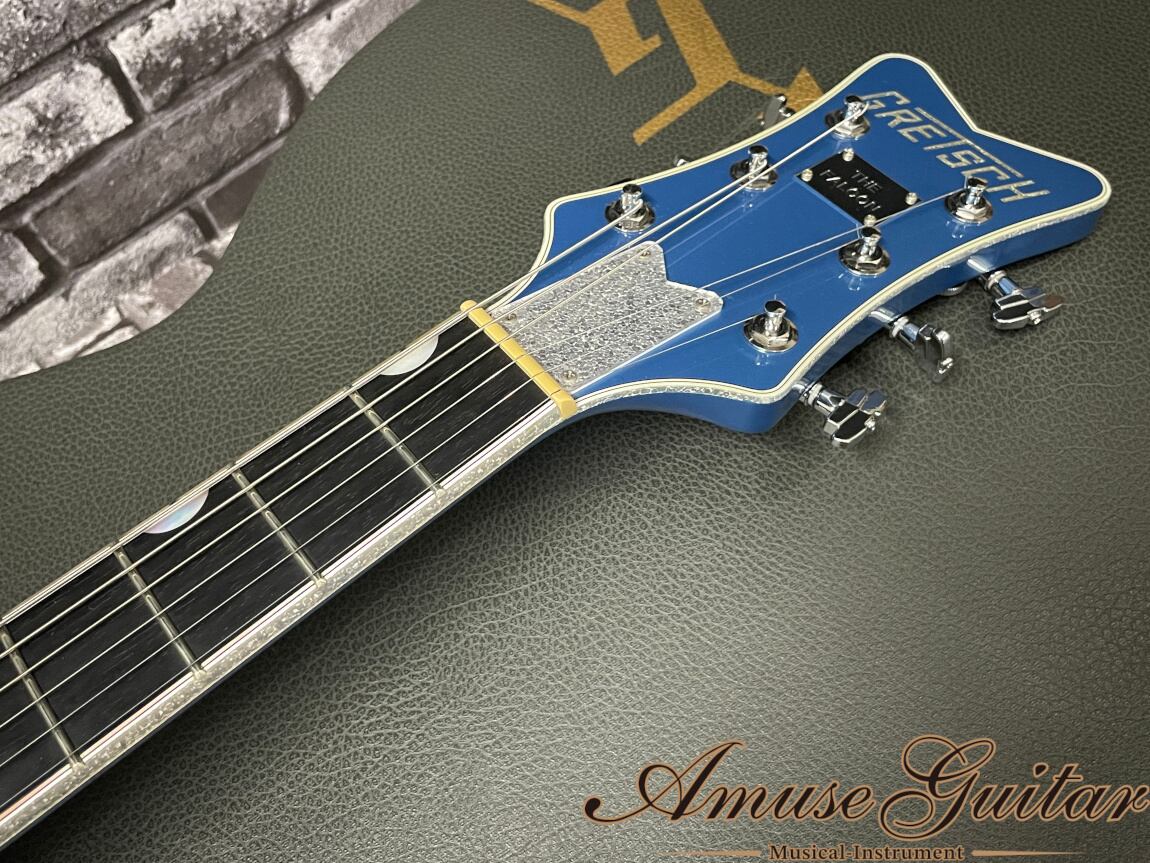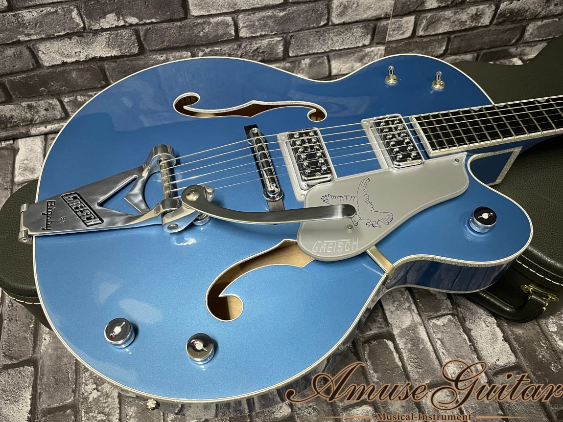 まずスペックとしては、17インチ幅&シングルカッタウェイの定番ファルコンスタイルで、アーチドトップのボディにはラミネーテッドメイプルを採用し、1959年スタイルの2.75インチボディ厚&トレッスル・ブレーシング仕様。レイクプラシッドブルーカラーフィニッシュと、シルバースパークルバインディング&トラスカバーを組み合わせ、引き締まった印象を持たせる爽やかなルックス。メイプルネックには真っ黒なエボニーフィンガーボードを採用し、ポジションマークはネオクラシック・サムネイルが使われております。その他としては、ファルコンヘッドのホリゾンタルロゴ、アジャストマティック&ピン留めロッキングバーブリッジ(台座はエボニー)、グレッチロゴ&ファルコンのグラフィックの入ったシルバーピックガード、ジュエルド・アローのコントロールノブ、GRETSCHロゴ入りのB6CPビグスビーユニット(ストリングスルータイプ)、ダイヤルロック式のグローバー製インペリアルロッキングチューナー、ヘッドトップには”THE FALCON”の刻印が入れられたプレートなどが挙げられます。