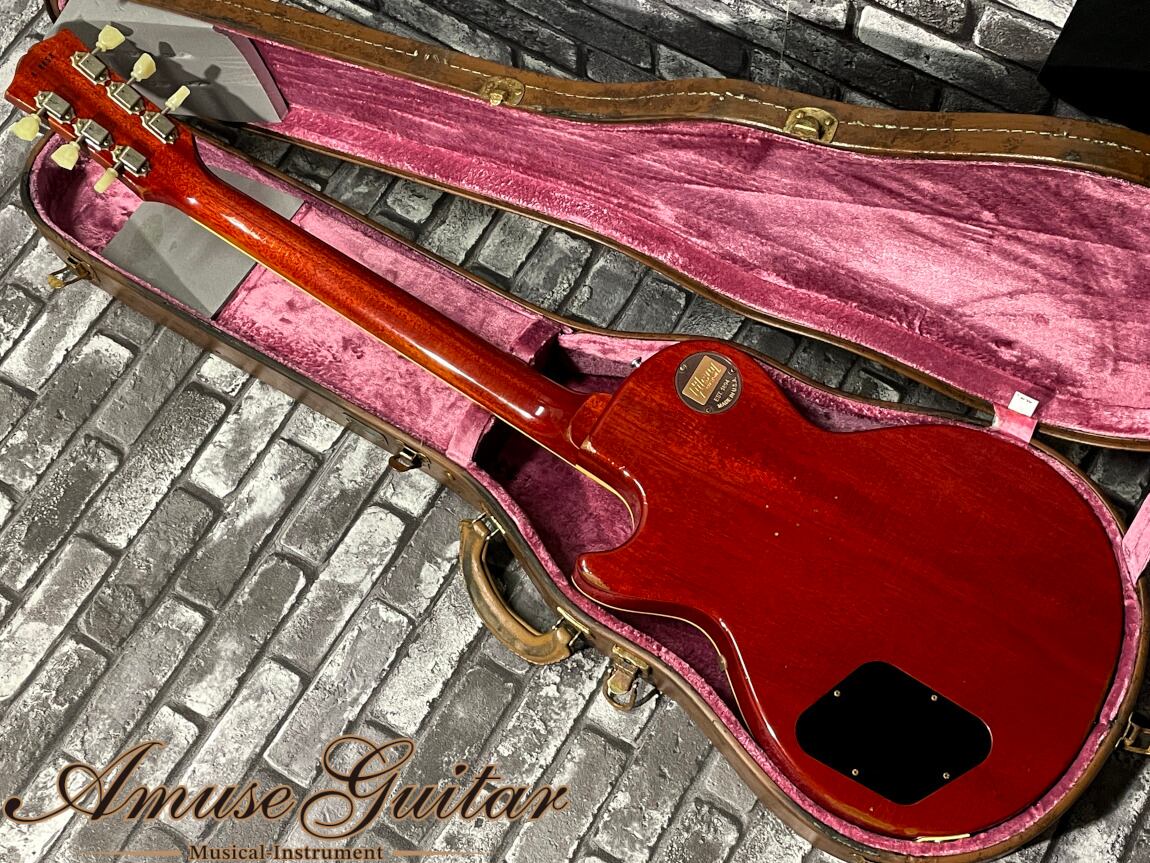 そして気になるサウンドですが、True HistoricやCollector’s Choiceなどとも全く引けを取らないどころか、それすらも凌駕していると感じさせる最高峰のバーストサウンドを放ちます。59LPよりも若干太めのネックとなるため、全てのレスポールモデルを通して、一番ネック抜けが良いとされる本機ですが、特にこの一本は生鳴りだけでもその鳴りの素晴らしさに驚き、アンプを通して出力すれば、そのヴィンテージライクな味わい深いサウンドに驚き、本当にサウンドの良い激鳴りの個体です。ピックアップにはオリジナルのカスタムバッカー×2を搭載し、1958モデルならではの図太く奥行をシッカリ感じるトーンを放ちます。ローミッドの太く抜ける粘りのあるトーンやハイゲインにも負けない輪郭のシッカリとした煌びやかなハイレンジと非常にバランス良く、これぞ当たりのレスポールだと思わずガッツポーズしたくなる素晴らしい一本です。クリーン〜クランチからオーバードライブサウンドまで幅広く対応する最高のレスポールです。
