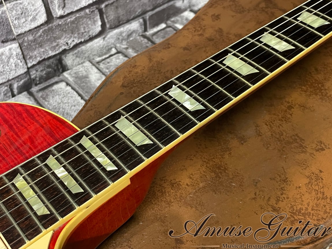 まずそのスペックとしては、ボディトップには日本限定の特別仕様ならではの極上のハードロックメイプルを採用。ヴィンテージのオリジナルBurst同様に見る角度によって様々に杢目を変化させるワイルドな3Dフィギュアドかつ、硬質なメイプル材特有のフレックラインも全体にかなり多数入ったヴィンテージファンには溜らない”通”好みの素晴らしい材が採用されております。またボディのアーチドもリファインされた新たな起伏のカーブを持ち、フィニッシュにはヴィンテージに忠実かつ深く味わいのあるニュアンスを再現したCrimson Burstカラーを採用しております。ボディバック&ネックのマホガニーも非常に良質な材が採用されており、ボディバックは美しい柾目取りかつシットリとしたフィギュアドライクなギラつきを魅せ、ネックバックは薄っすらながらフレイムフィギュアドが浮かび上がります。また杢目の良さだけでなく総重量は約4.02kgとTrue Historicシリーズ同等の軽量な個体となっております。指板のローズウッドは非常に色濃いコントラストにシッカリとした黒い杢目が走るハカランダライクな素晴らしい材が採用されております。