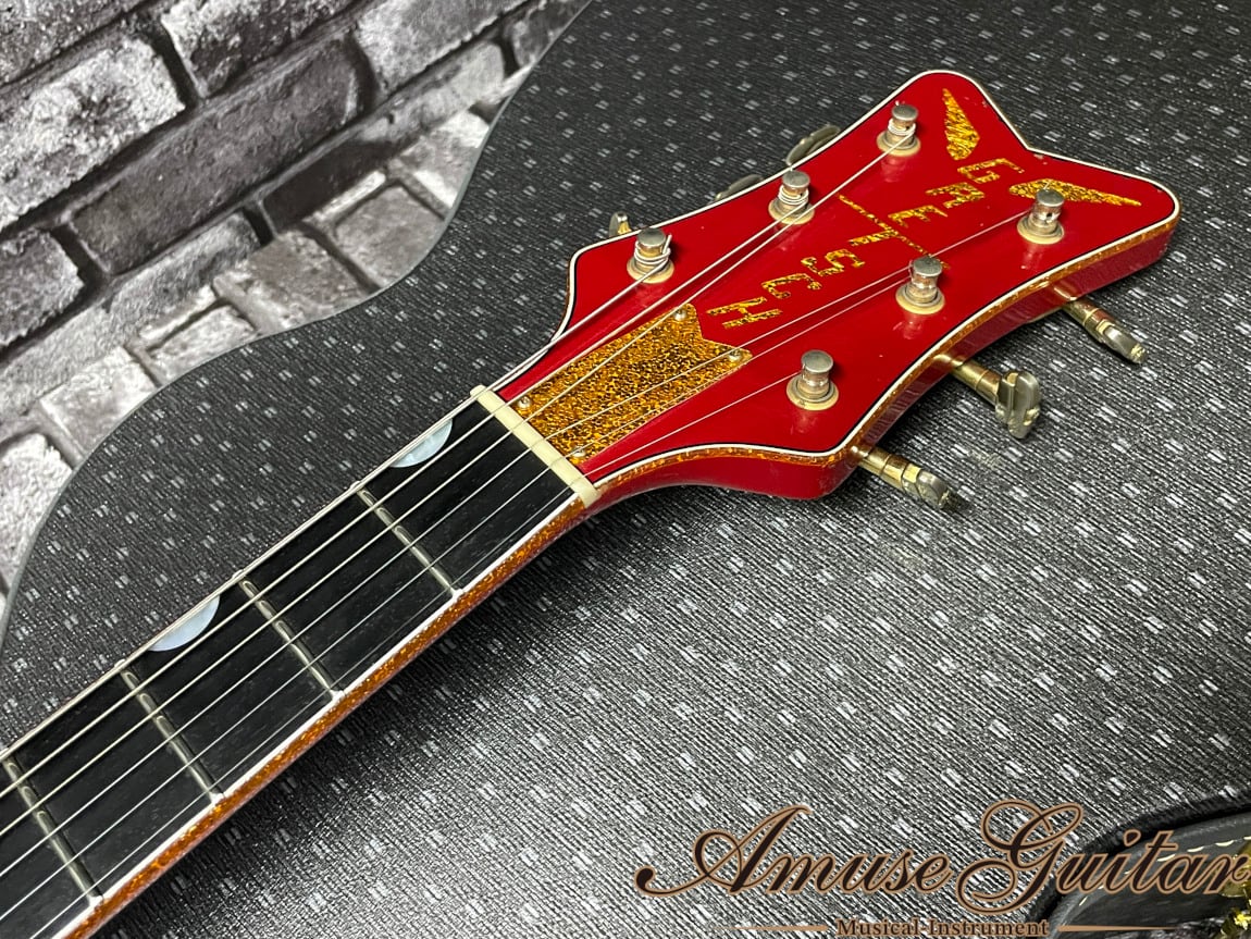 まずそのスペックとしては、Duo Jet同様でシングルカットのチャンバードマホガニーボディが採用されながら、トップ材にはメイプルを採用する特別仕様。フィニッシュカラーはグレッチのドラムラインナップでもお馴染みのヴィンテージアメリカンを象徴するダコタレッドを採用。ネックはマホガニーに、真っ黒で目の詰まったエボニー指板、ポジションマークにはサムネイルインレイが施されております。ヘッドはファルコン同様のバーチカルヘッドを採用し、ネック&ヘッド共にボディと同様のマッチングフィニッシュとなっております。またボディトップ&バック、指板外周、ヘッドトップはゴールドフレーク・バインディングが施されます。その他のスペックとしては、ペンギンのワンポイントが入れられたゴールドピックガード&PUエスカッション、センターにパーロイドが仕込まれたジュエルアローノブ、ゴールドフレークのトラスロッドカバー、エルボーガード、グローバー製インペリアルチューナー、ブリッジはエボニー材&ピン留め台座のABR-1タイプ・アジャストマティックブリッジに、GRETSCHの”G”ロゴの入れられたキャデラックテイルピースを搭載。ハードウェアはビスに至るまでゴールドで統一されておりますが、派手過ぎる印象は無く、ボディのダコタレッドカラー&ラメパーツ/バインディングと非常に良くマッチしており、豪華ながらに落ち着いた雰囲気も感じさせます。モデル名としては”58”と1958スペックを意味しており、TVクラシックハムバッカーや、インレイ、パーツチョイスなど、センスの高い特別仕様となっております。また採用材のクオリティから組み込み、ギブソン社レスポール同様のエッジドバインディング処理、そしてヴィンテージ顔負けのリアルなウェザーチェッキング・エイジドワークには流石マスタービルダー、ステファン・スターンの製作品だと頷ける高いクオリティと、こちらの特別な一本に懸ける意気込みが伝わってきます。