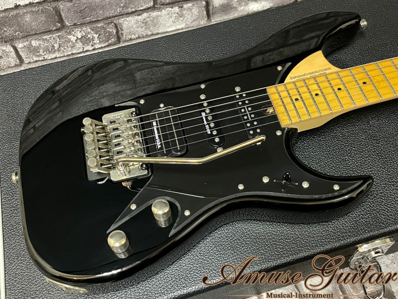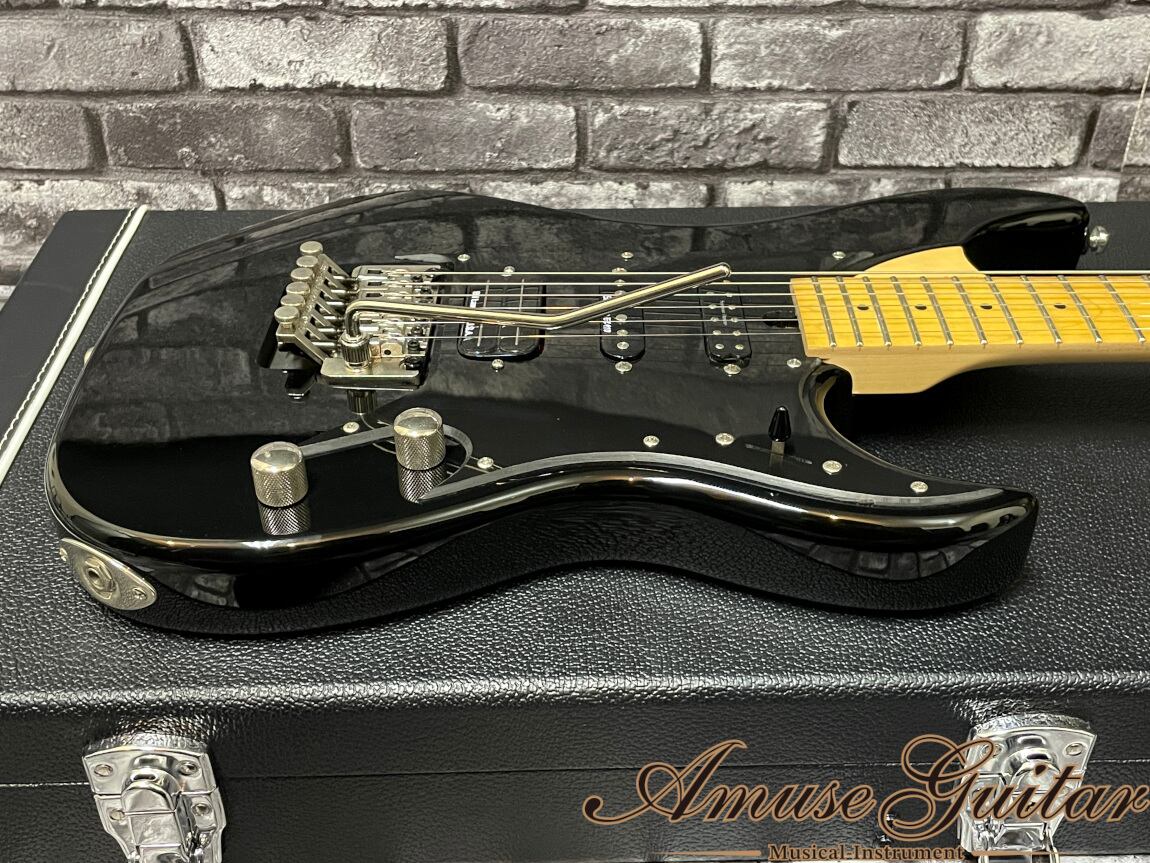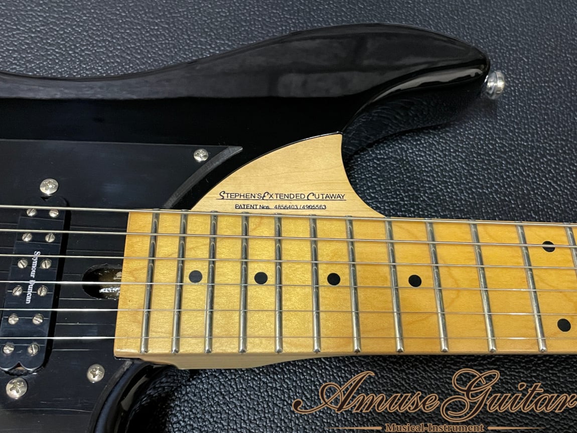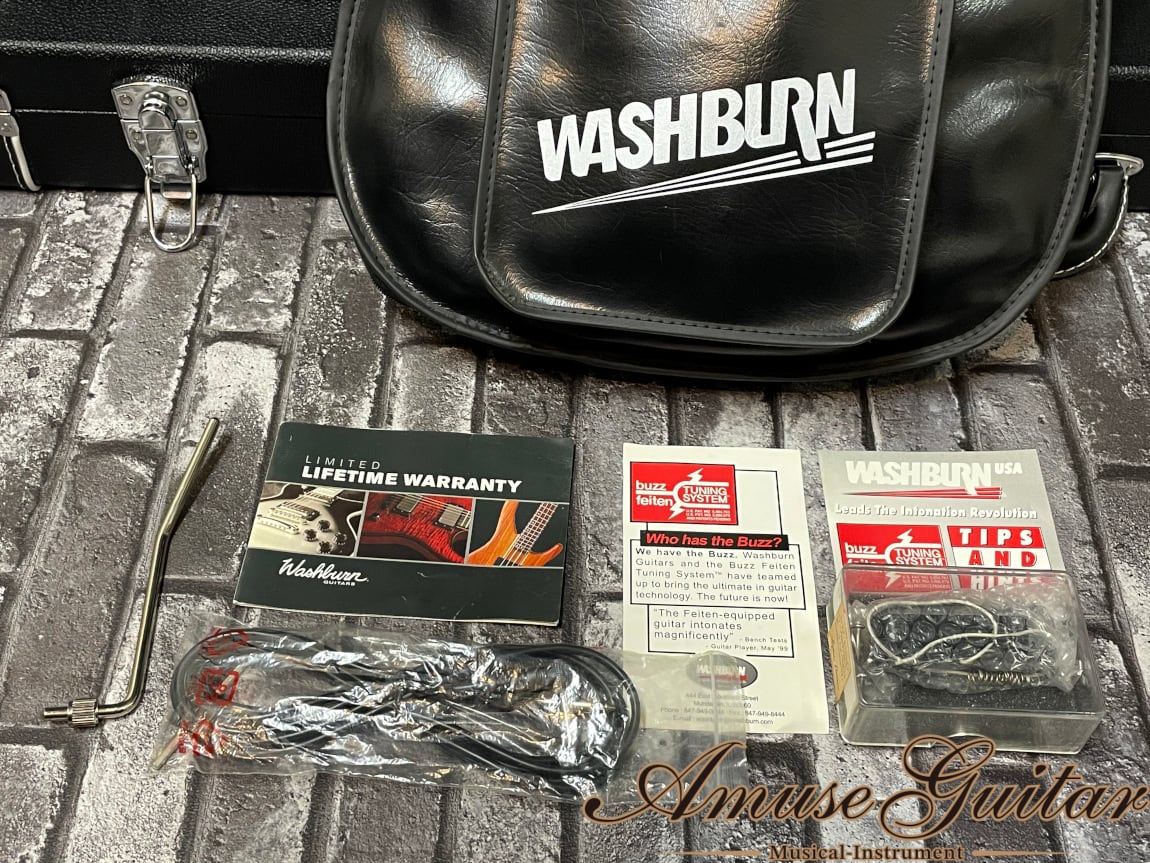こちらのスペックは、アルダーボディ、メイプルネック/メイプル指板の木材マテリアル。ボルトオン構造となりますが、ワッシュバーン独自の機構【Stephen’s Extended Cutaway】をジョイント部に採用しており、ハイフレットのアクセスはほぼノーストレスな画期的なデザイン。その他としましては5wayピックアップセレクター/マスターヴォリューム/マスタートーンのコントロール、リバースヘッド、フロイドローズライセンスブリッジ&ナット、ネックエンド部にトラス調整穴などが挙げられます。