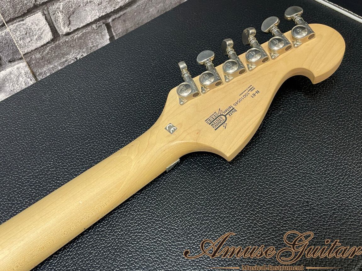 気になる状態ですが、細かなスレ/打痕/パーツの使用感等はございますが、大きなダメージは無く、生産から14年経過しているとは思えないかなり綺麗な状態です。バックパネルは欠品。ネック状態も良く、捩れもないストレート、トラスロッドの余裕も確認済み。フレット残りも8~9割とまだまだ使えます。付属はアーム、オリジナルロゴ入りGIGケースです。