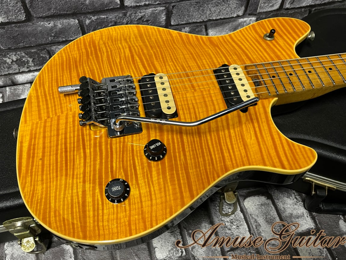まずそのスペックとしては、バスウッドの3Pバック/目にも美しいフレイムメイプルトップボディに人気のアンバーカラーのグロス仕上げにてフィニッシュされ、トップにはアイボリーのバインディングが施されます。カーボングラファイトによって補強されたネックには近年では絶対に手に入らないな・・と感じさせる強烈なバーズアイのフィギュアドメイプルを採用。もちろん指板は貼りメイプル仕様でこちらにもバーズアイが浮かびます。ネックシェイプは手の形状にあったフィット感良い非対称シェイプ。その他同じ向きに合わされたゼブラカラーのハムバッカーやPeaveyロゴ入りフロイドローズ&ロックナット、D-Tuner、シャーラーチューナーなどが挙げられます。またヘッド裏には本国USAメイドを示す91シリアル、ゴールドロゴ、PAT.PEND焼印、EVHロゴ、また本人同様のサウンドを追及すべく、フレットをステンレスのミディアムジャンボサイズ、フロイドローズのトレモロブロックをFU-Toneのブラスパーツ、更にトレモロスプリングにもFU-ToneのSilent Springs、アーム部はより細かな表現を可能にすべくアソびの少ないRED BISHOP MAGIK-ARMにアップグレードが施されております。