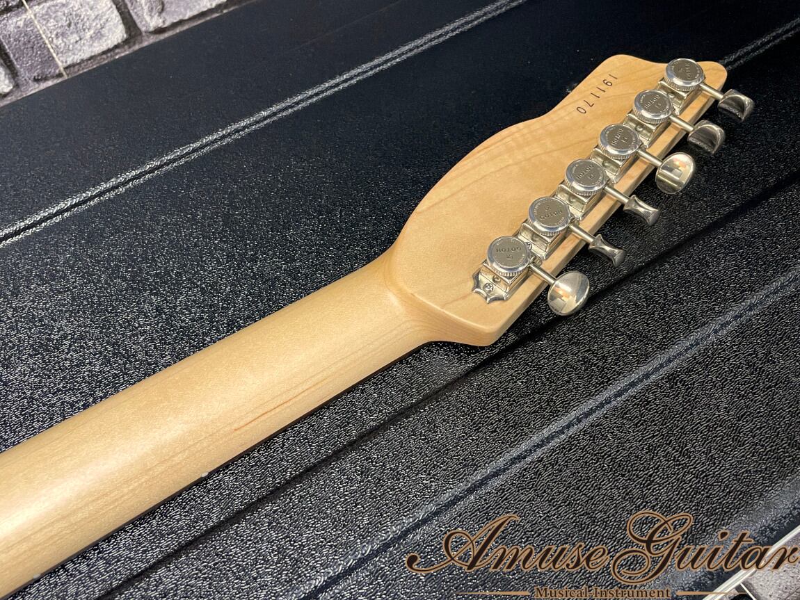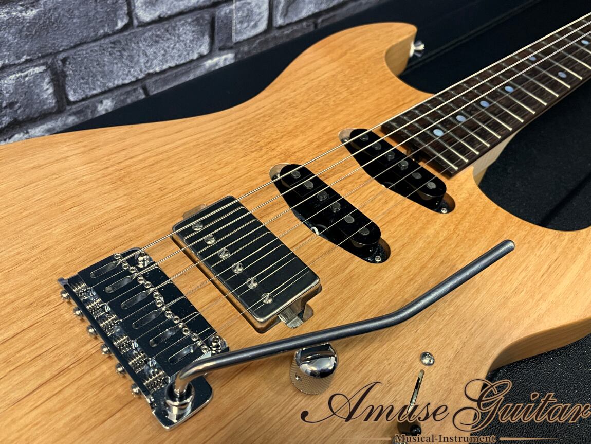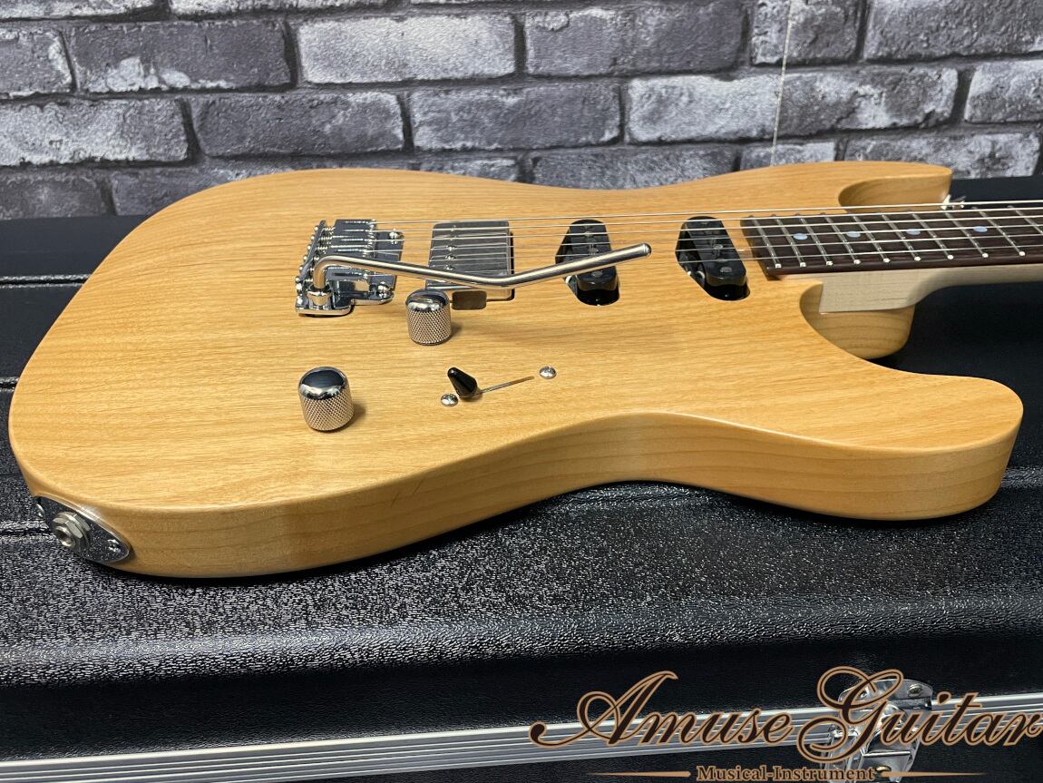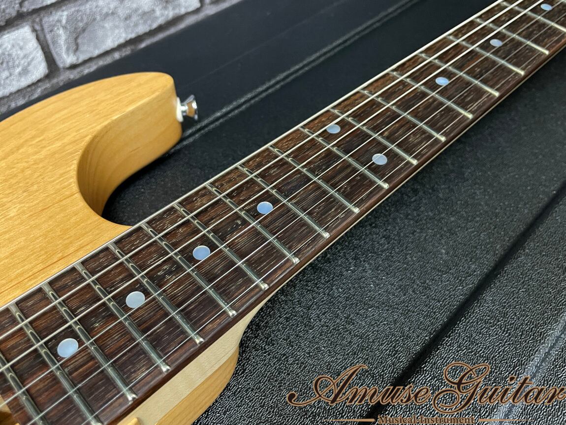 こちらのスペックですが、トップに緩やかなアーチ形状をもったボディには木目の整ったアルダー、ネックにはフレックラインも確認できる剛性の優れた板目取りのメイプル、指板には黒々としたコントラストが素晴らしいローズウッドを採用した木材マテリアル。オリジナルヘッドシェイプ上のロゴは、ナチュラルフィニッシュ(ネイキッド)には珍しいシルバーのロゴもポイントの一つ。指板には通常は採用されていないホワイトパールドットがオプションスペックにて施されます。その他としては、42mm幅のグラファイトナット、ジャンボフレット(Jescar NS FW-51100)のツバ出し22F仕様、10-12インチのフラットなコンパウンドラディアス、ロックチューナー(GOTOH SD91 MG-T)、2点支持シンクロトレモロ(GOTOH 510T)等のプレイヤー目線にて考え尽くされたトラディッショナルなスペックが多数採用。特徴的な埋め込み式4点ボルトオンジョイント&ヒールレスカット等のモダンスペックも融合し、実際に手にして弾いてみればすぐに分かる拘り抜いた妥協の無い高いクオリティにて製作されております。