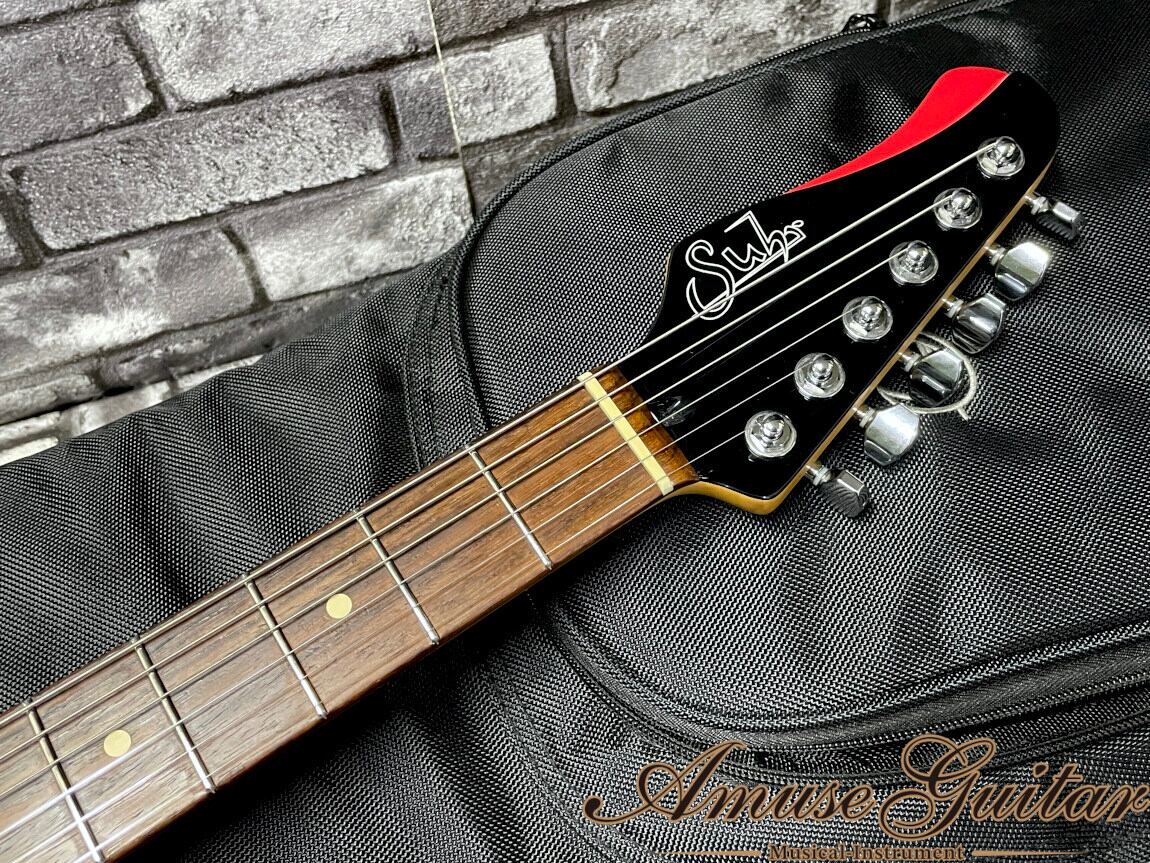 こちらのスペックですが、アルダーボディ、フレイムの杢目も確認できる良質な柾目(クオーターソン)メイプルネック、ブラウンの濃いローズウッドの木材マテリアル。ボルトオン仕様の22フレット、ロングスケール。トラディショナルなJMシェイプにアレンジを加えたオリジナルシェイプ、そしてSuhrオリジナルのヘッドストック2つを組み合わせて、ボディとマッチしたカラーのリバースヘッド。ブリッジは精度抜群のGOTOH 510(二点支持シンクロトレモロ)を採用し、アーミングも耐えうるチューニングの安定性を誇ります。その他としましては、60’s C Vintage Standardのサテン仕上げネックシェイプ、フレットはステンレスのミディアムジャンボタイプ、指板Rは10”-14”のコンパウンドラディアス、5wayPUセレクター/マスターヴォリューム/マスタートーンのコントロール、クレイドットのポジションが採用されております。