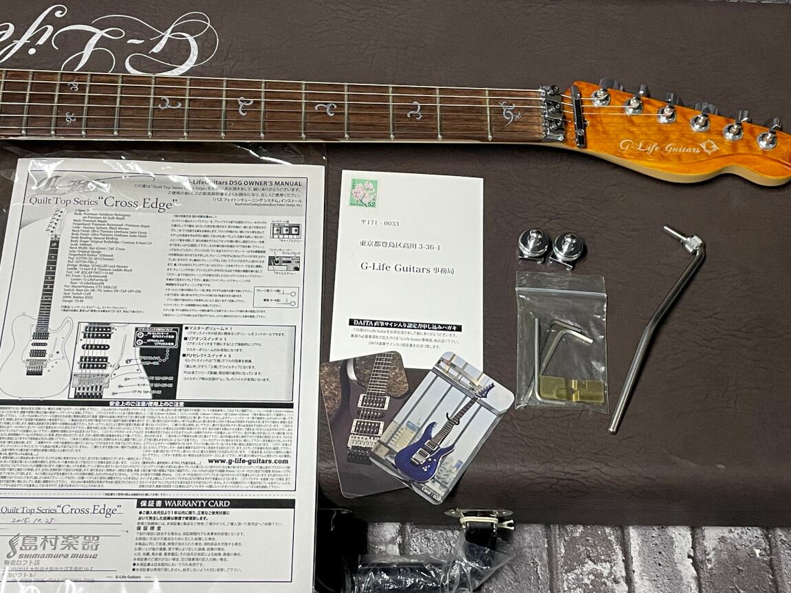 今回ご紹介させて頂きますのは、そのG-Lifeが製作したDAITA氏シグネイチャーモデル。それまで愛用していたESPやTom Andersonのエッセンスも盛り込まれながら、独自の機構や、実使用向けな仕様かつ、剛性に優れ、ルックスもエレガントにまとまった一本です。ビンテージシリーズCross Edgeを元にプレイアビリティやサウンドをよりモダンにアップグレードした最新のCross Edge Quilt Topモデル。莫大な材のストックを誇るG-Life Guitarsならではの極上かつ稀少なウッドマテリアルと、拘り抜いたプレイヤー目線で開発・製作された極めて高いクオリティから生まれる、サウンド&ルックス&プレイアビリティと3拍子揃ったハイエンドモデルになります。