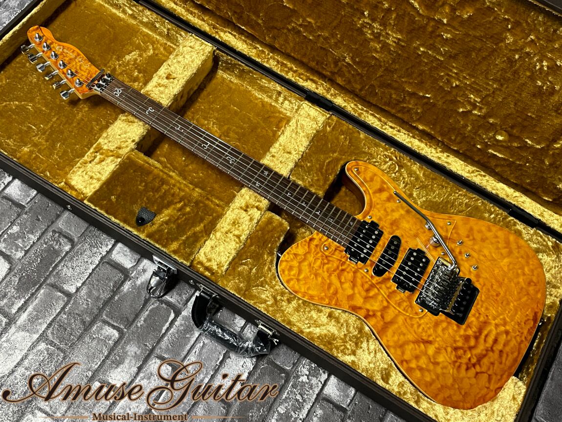 まずそのスぺックとしては、ボディトップには強烈過ぎる厳選されたセレクテッド4Aキルトメイプルをブックマッチにて採用し、数あるフィニッシュの中でも高い人気を誇るハニースフェーンカラーをハーフマット仕上げにてキルトフィギュアドとの最高のマリアージュを魅せ付けます。DAITA氏が愛用していた【TOM ANDERSON Drop Top T # Transparent Amber】を彷彿とさせるルックスで、ファンの心の琴線に触れる仕様です。もちろんフィニッシュ自体は激薄塗装にてサウンド面への影響もシッカリと考慮されております。またボディトップの外周はフィギュアドの杢目を生かしたナチュラルバインディング仕上げにて妥協を許しません。ボディバックにはトップグレードのホンジュラスマホガニーを採用し、美しい木取りかつ角度によってギラつきを魅せる最高の材となっております。続いてネックにはサウンドへの恩恵も大きい硬質なトップグレードのハードメイプルが採用され、しっかりとしたフレックラインや薄っすら浮かぶフィギュアドを持つ素晴らしい材にて、こちらは所謂貼りメイプル仕様となっております。加えて指板インレイにはDAITA氏の象徴となるトライバルライクな通称”D-ロゴ”インレイが手作業にて埋め込まれ唯一無二の高級感を醸し出しております。ヘッドはボディ同様のキルト突板&マッチングカラー仕上げ。ジョイント部はセットネック方式を採用しながらもスルーネックとも思わせる驚愕の技術介入が施され、サウンド面にも大きな影響を与えます。ヒールレスカットについても、しっかりとした強度も計算されながらに極限まで削り込む事で、初期モデルよりも深いカッタウェイ形状とも併せて24F仕様のポテンシャルを完全に生かした高いプレイアビリティを誇ります。その他としてはトップのフィギュアドを生かしたクリアタイプのピックガード、ロック式のストラップピン、最新スペックとなるGotoh製SG-381 MG-Tチューナーにてペグポストの高さは3段階のロック式に、ヘッド形状は独自のスタイルにてブランドロゴが施されます。細部スペックとしては648mmロングスケール、ナット幅は41.5mmと細目ながらも握り込んだ際に手に馴染むように肉付きを残したオリジナルのプロフィール、プレイアビリティを意識したドロップトップやバックコンター、リアのダイレクトスイッチは前モデルよりも大きいタイプへ変更し、位置もDSGシリーズに合わせる事で瞬時の切り替えがよりスムーズになっております。パーツ類はクロムカラーで統一し、極上のルックス、高いプレイアビリティを含め、DAITA氏の拘りが詰まったアーティスティックで芸術的な仕上がりとなっております。