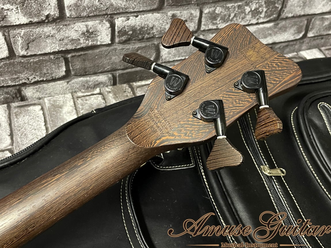 こちらのスペックは、ボディにブビンガ、ネックにはウェンジ3P、指板にもウェンジを採用した木材マテリアル。ボルトオン構造のロングスケール、24フレット仕様。小ぶりなボディは立体的なシェイプとなっており体へのフィット感が非常に優れ、ライブユース、ハウスユースともにストレスは最小限です。ジャンボサイズのブロンズフレットに、高さ調整が可能なブラスナット。独自の構造となる2Pセパレートブリッジ、ヘッドにはブランドロゴインレイ、ウッドトラスカバー&ボディ同様塗装されたウッドバックパネル、ハードウェアはシックなブラックにて統一されております。その他としては9V電池を用いず、バックパネルよりUSBケーブルにて充電できるようになっています。