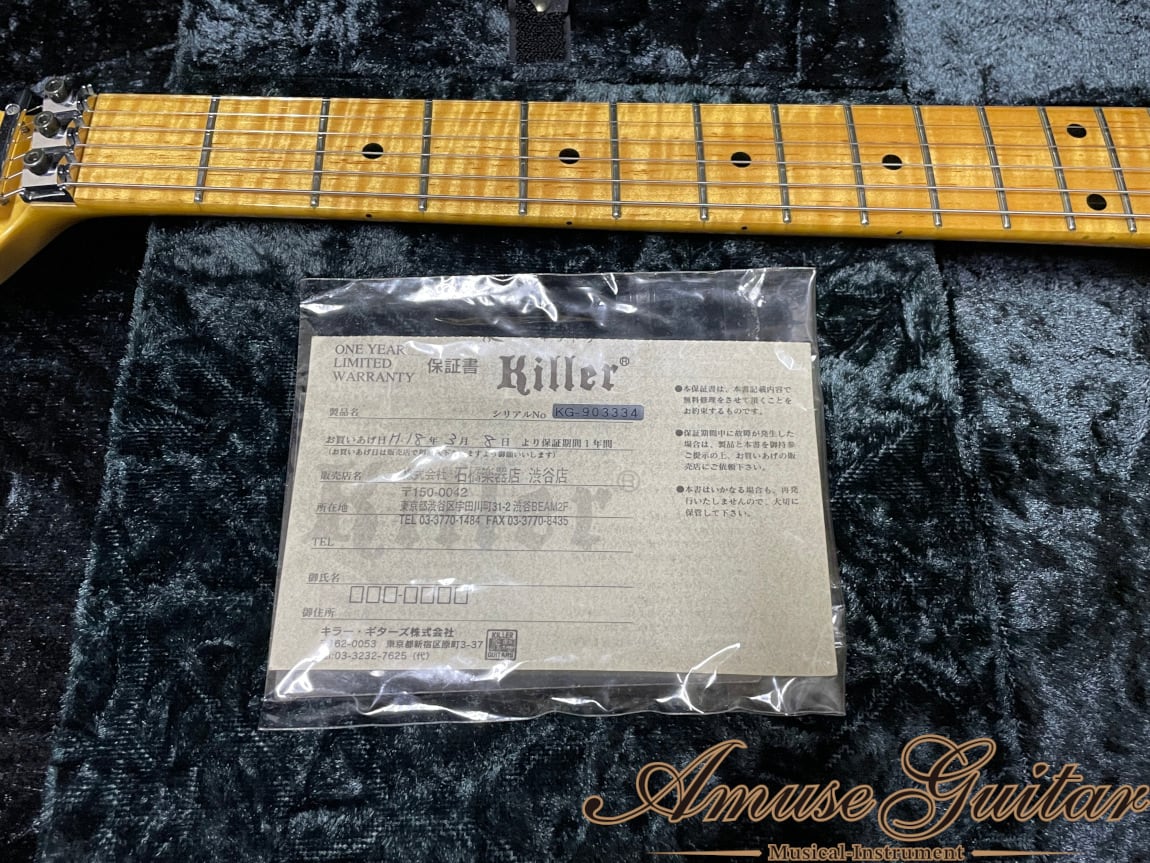 気になる状態ですが、細かなポツ打痕、スレ、パーツの経年はございますが、激しく使用感のある個体も多いプライムですが、前オーナー様による丁寧な取扱いにより非常に良い状態を保っています。ネック状態も非常によく、現状ほぼストレート、トラスロッドの余裕もしっかりと確認済み。フレット残りは約7~8割とまだまだ使えます。付属品は、メーカー発行の保証書、アーム、オプション(通常はGIGケース)となるキラーロゴ入りオリジナルハードケース(現在廃番)となります。