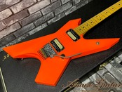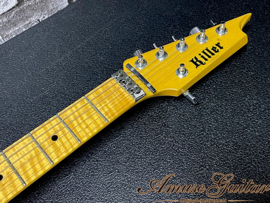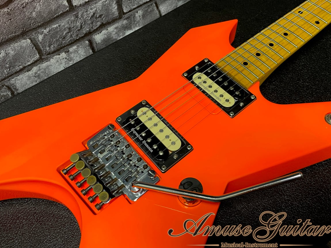 今回ご紹介させて頂きますのは、そのキラー発足のきっかけにもなった高崎晃氏のメインギターシリーズの”プライム”です。1988年頃より生産/開発が始まり、その先進的スペックはその時代に応じて更新/進化されていきました。高崎氏の要望を基に定番スペックを更に発展/応用し、進化したスペックとなっており、現在の高崎氏ステージ/レコーディングでも活躍する究極のモデル。そしてその中でも2001年、13年ぶりにオリジナルメンバーが集結し再結成を行ったライブにて使用されその発色の良さの印象が強い、現在は廃番モデルとなる“オレンジサンシャイン”が状態良好にて入荷致しました。